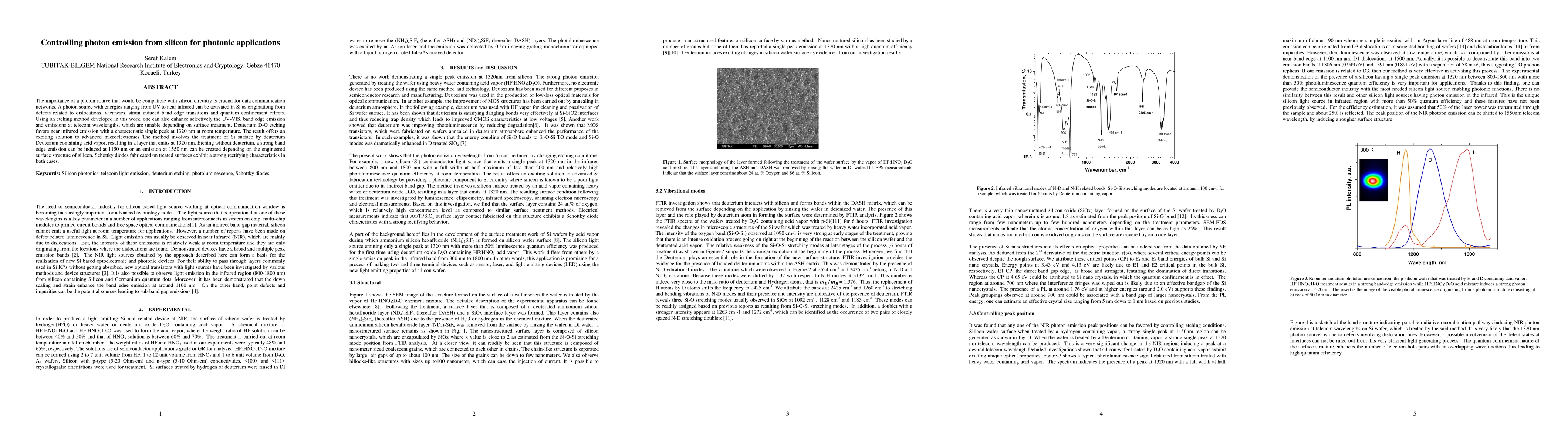 The importance of a photon source that would be compatible with silicon circuitry is crucial for data communication networks. A photon source with energies ranging from UV to near infrared can be activated in Si as originationg from defects related to dislocations, vacancies, strain induced band edge transitions and quantum confinement effects. Using an etching method developed in this work, one can also enhance selectively the UV-VIS, band edge emission and emissions at telecom wavelengths, which are tunable depending on surface treatment. Deuterium D2O etching favors near infrared emission with a characteristic single peak at 1320 nm at room temperature. The result offers an exciting solution to advanced microelectronics The method involves the treatment of Si surface by deuterium Deuterium containing acid vapor, resulting in a layer that emits at 1320 nm. Etching without deuterium, a strong band edge emission can be induced at 1150 nm or an emission at 1550 nm can be created depending on the engineered surface structure of silicon. Schottky diodes fabricated on treated surfaces exhibit a strong rectifying characteristics in both cases.