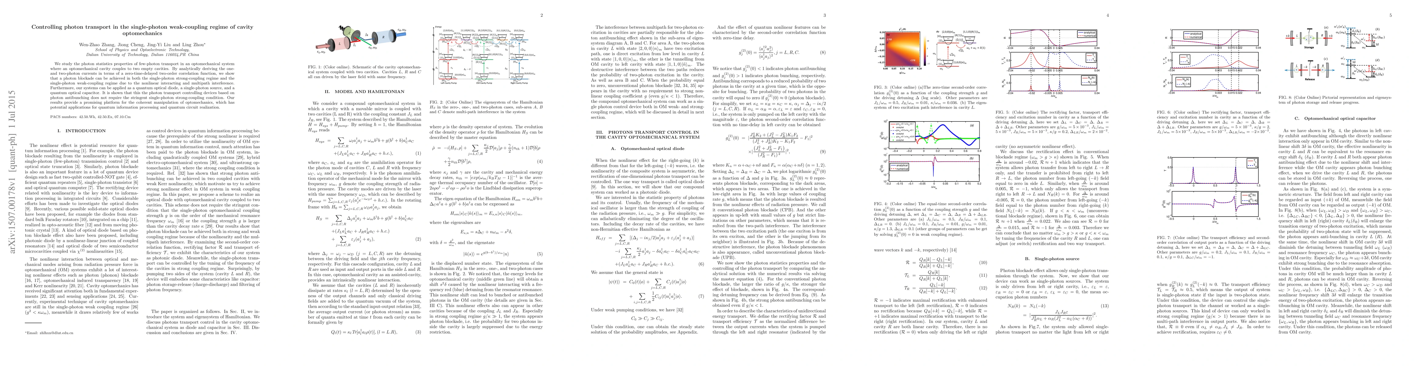 This paper investigates photon transport in an optomechanical system with weak coupling, demonstrating photon blockade via nonlinear interactions and multipath interference. The proposed system functions as a quantum optical diode, single-photon source, and capacitor, offering a platform for quantum information processing without requiring strong coupling conditions.