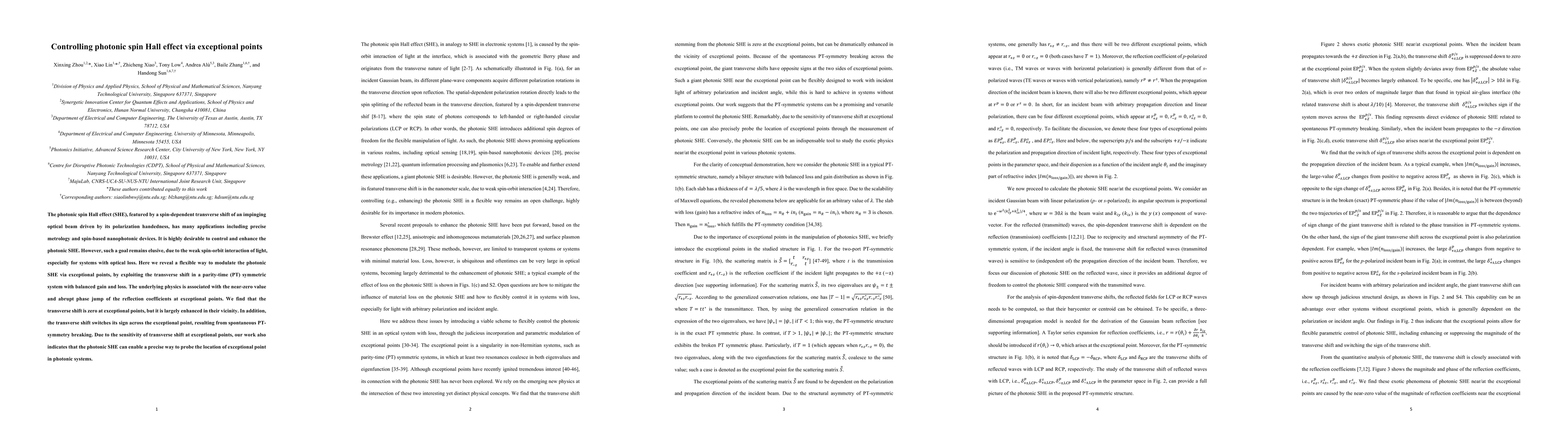This paper explores controlling the photonic spin Hall effect (SHE) through exceptional points in PT-symmetric systems, demonstrating significant enhancement and sign-switching of the transverse shift near these points, offering precise metrology and potential applications in spin-based nanophotonic devices.