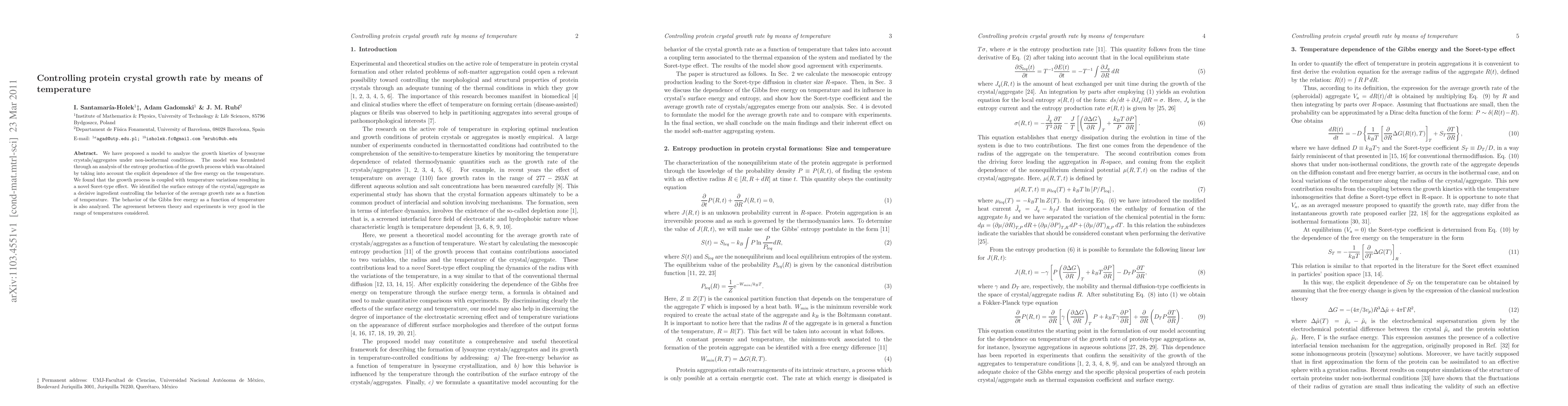 We have proposed a model to analyze the growth kinetics of lysozyme crystals/aggregates under non-isothermal conditions. The model was formulated through an analysis of the entropy production of the growth process which was obtained by taking into account the explicit dependence of the free energy on the temperature. We found that the growth process is coupled with temperature variations resulting in a novel Soret-type effect. We identified the surface entropy of the crystal/aggregate as a decisive ingredient controlling the behavior of the average growth rate as a function of temperature. The behavior of the Gibbs free energy as a function of temperature is also analyzed. The agreement between theory and experiments is very good in the range of temperatures considered.