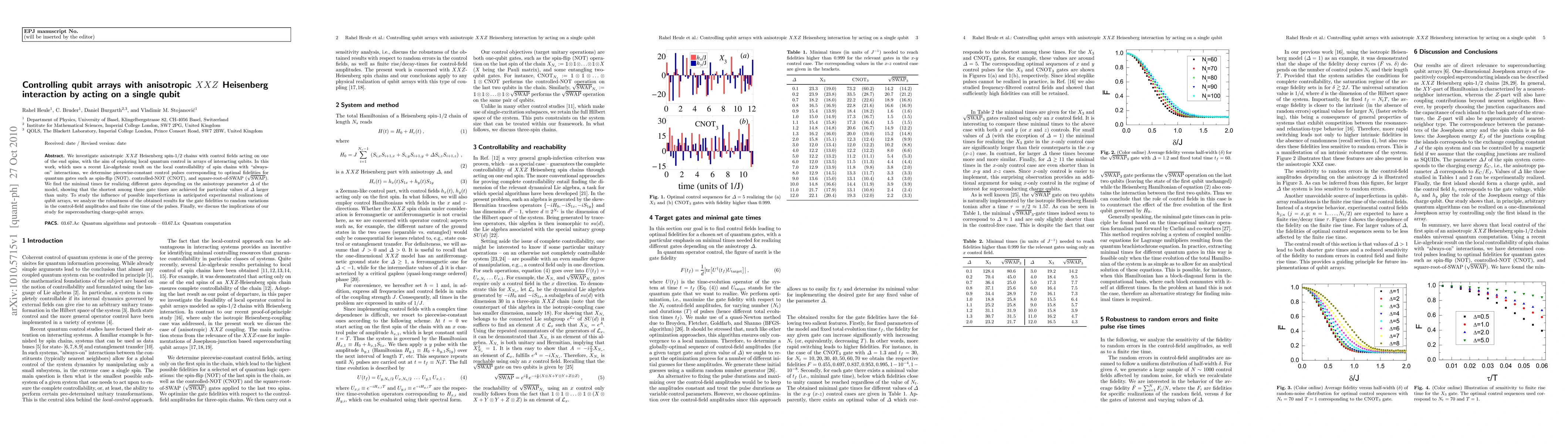 We investigate anisotropic $XXZ$ Heisenberg spin-1/2 chains with control fields acting on one of the end spins, with the aim of exploring local quantum control in arrays of interacting qubits. In this work, which uses a recent Lie-algebraic result on the local controllability of spin chains with "always-on" interactions, we determine piecewise-constant control pulses corresponding to optimal fidelities for quantum gates such as spin-flip (NOT), controlled-NOT (CNOT), and square-root-of-SWAP ($\sqrt{\textrm{SWAP}}$). We find the minimal times for realizing different gates depending on the anisotropy parameter $\Delta$ of the model, showing that the shortest among these gate times are achieved for particular values of $\Delta$ larger than unity. To study the influence of possible imperfections in anticipated experimental realizations of qubit arrays, we analyze the robustness of the obtained results for the gate fidelities to random variations in the control-field amplitudes and finite rise time of the pulses. Finally, we discuss the implications of our study for superconducting charge-qubit arrays.