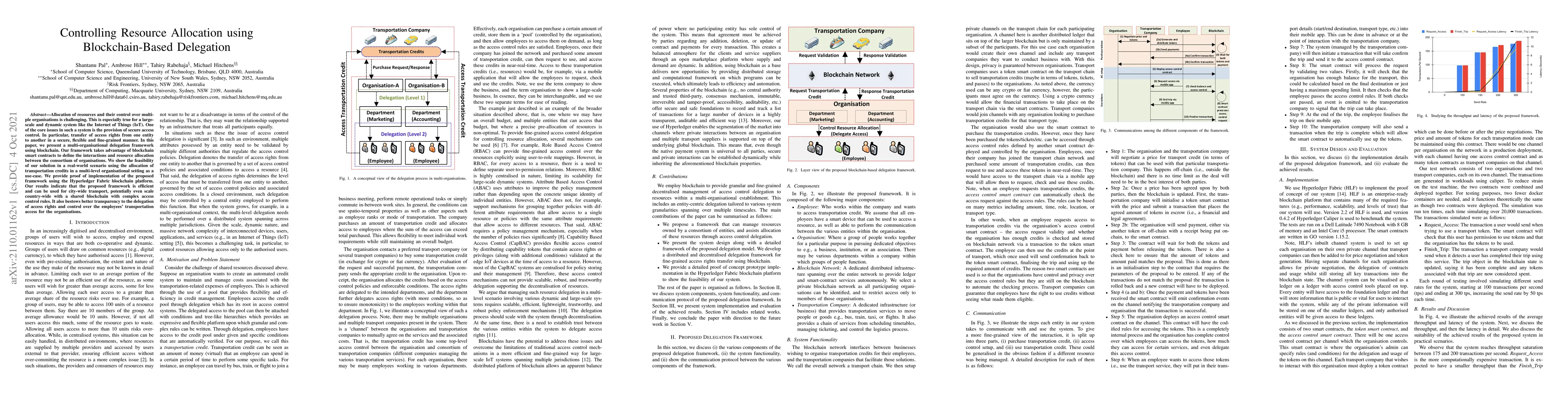 Allocation of resources and their control over multiple organisations is challenging. This is especially true for a large-scale and dynamic system like the Internet of Things (IoT). One of the core issues in such a system is the provision of secure access control. In particular, transfer of access rights from one entity to another in a secure, flexible and fine-grained manner. In this paper, we present a multi-organisational delegation framework using blockchain. Our framework takes advantage of blockchain smart contracts to define the interactions and resource allocation between the consortium of organisations. We show the feasibility of our solution in a real-world scenario using the allocation of transportation credits in a multi-level organisational setting as a use-case. We provide proof of implementation of the proposed framework using the Hyperledger Fabric blockchain platform. Our results indicate that the proposed framework is efficient and can be used for city-wide transport, potentially even scale country-wide with a shared blockchain with complex access control rules. It also bestows better transparency to the delegation of access rights and control over the employees' transportation access for the organisations.