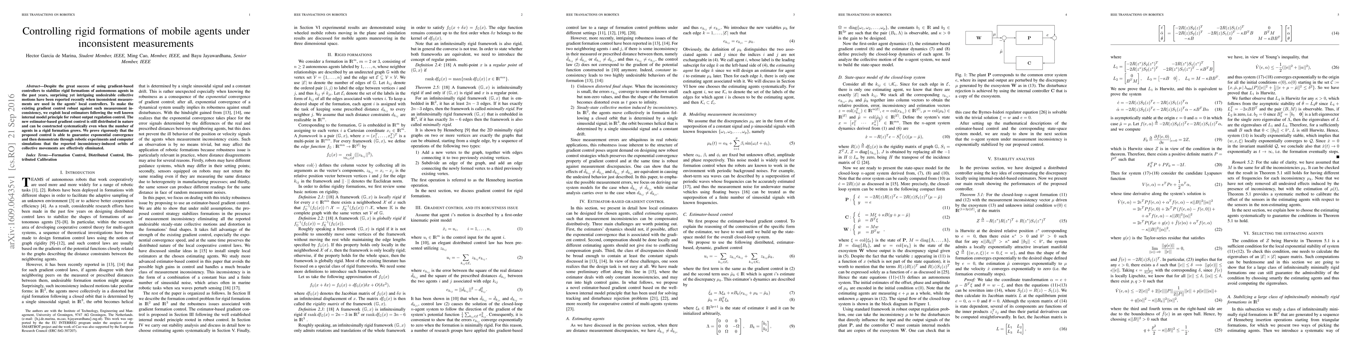 This paper proposes a distributed estimator-based gradient control method to stabilize rigid formations of mobile agents, addressing the issue of undesirable collective motions caused by inconsistent measurements. The new control scheme guarantees exponential convergence and effectively eliminates inconsistency-induced orbits, as demonstrated through robotic experiments and simulations.