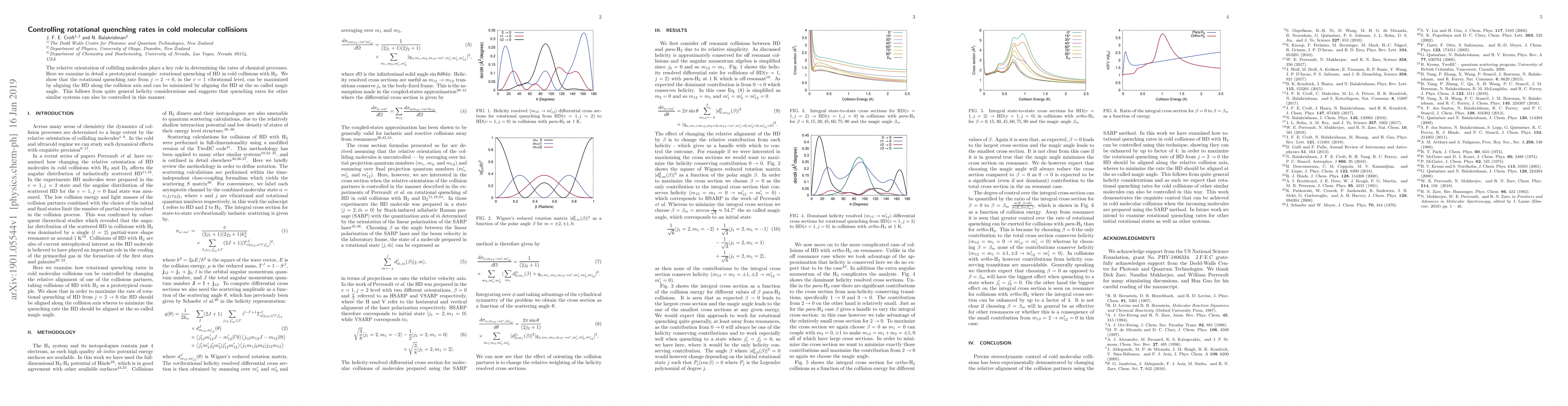 This paper investigates the rotational quenching rates of HD molecules in cold collisions with H2, demonstrating that the quenching rate can be maximized by aligning HD along the collision axis and minimized at the magic angle, based on general helicity principles. This suggests a method for controlling quenching rates in similar molecular systems.