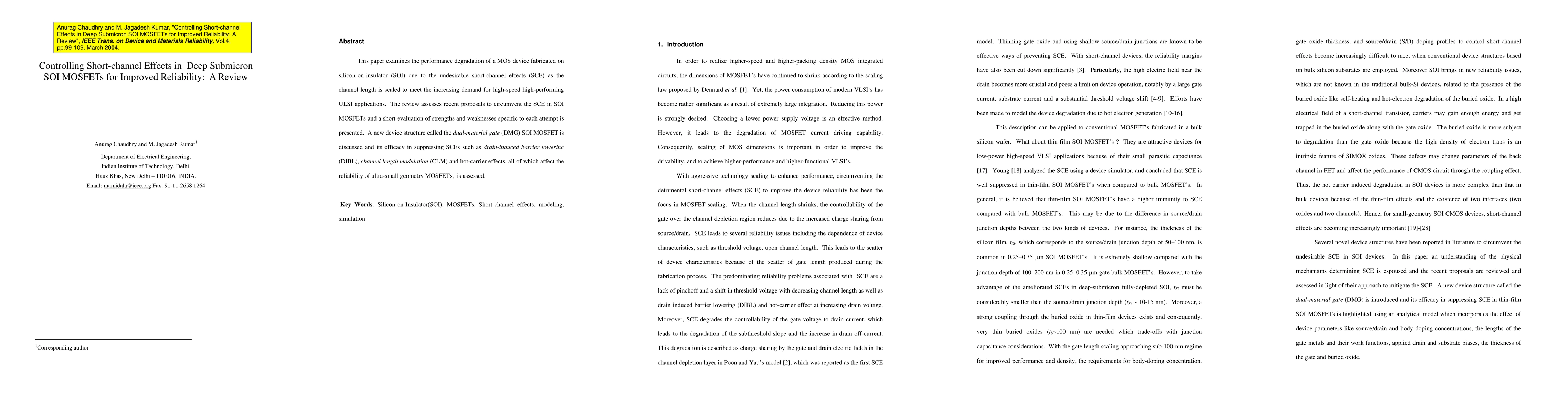 This paper reviews strategies to mitigate short-channel effects (SCE) in deep submicron silicon-on-insulator (SOI) MOSFETs, focusing on reliability improvements. It evaluates recent proposals and highlights the dual-material gate (DMG) SOI MOSFET as an effective solution for suppressing SCEs, including drain-induced barrier lowering, channel length modulation, and hot-carrier effects.