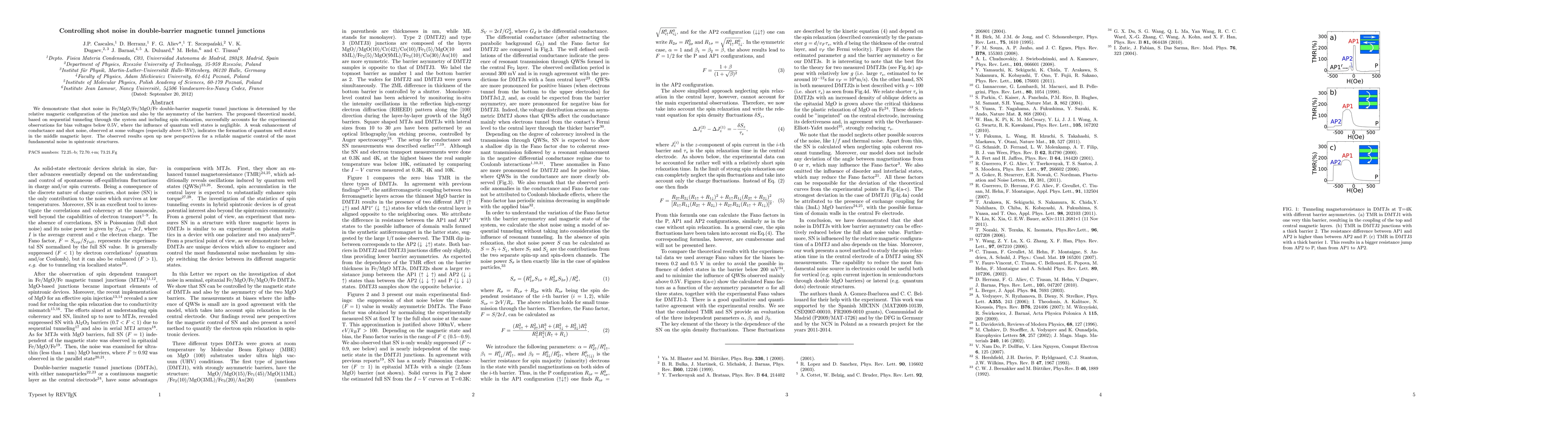 This paper demonstrates that shot noise in double-barrier magnetic tunnel junctions is influenced by the magnetic configuration and barrier asymmetry, with a theoretical model explaining observations under low bias voltages. At higher voltages, quantum well states emerge, suggesting potential for magnetic control of fundamental noise in spintronic devices.