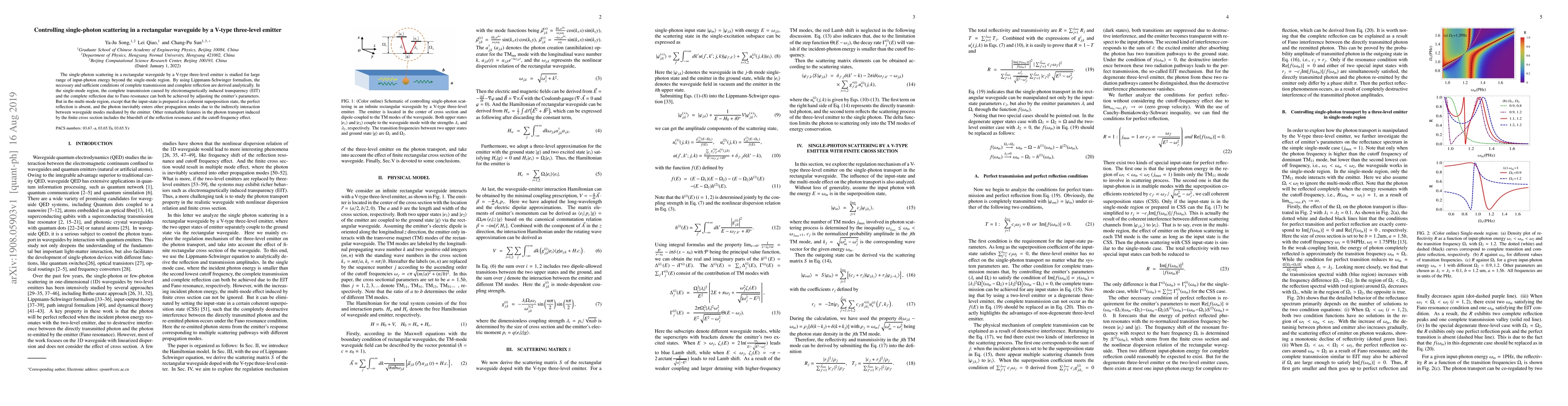 This paper investigates single-photon scattering in a rectangular waveguide by a V-type three-level emitter, deriving analytical conditions for complete transmission and reflection. In the single-mode region, EIT and Fano resonance enable perfect transmission and reflection, respectively, but in the multi-mode region, perfect reflection is unattainable due to mode interactions.