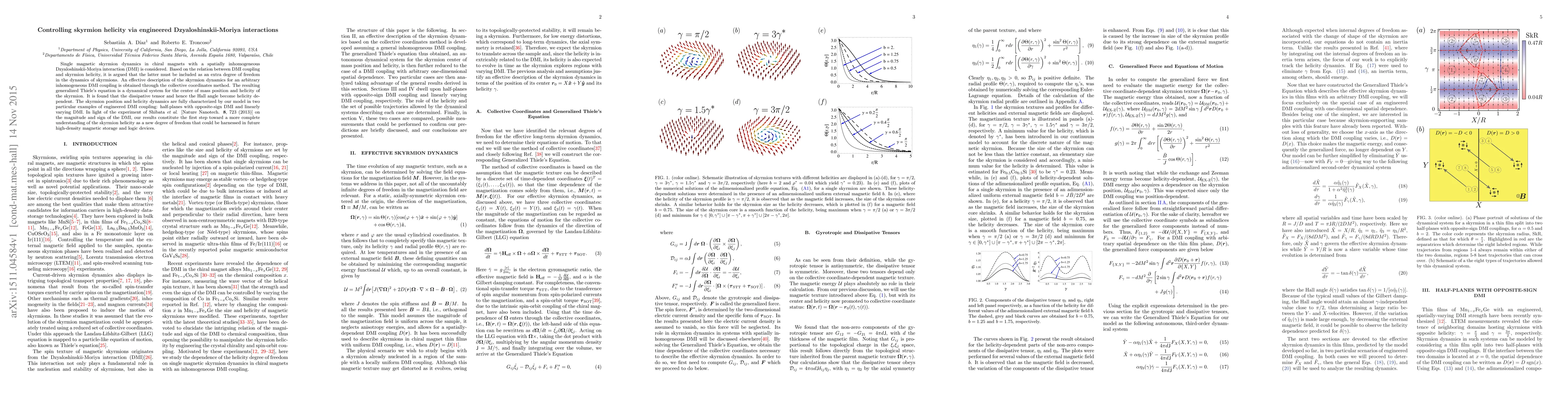 This paper investigates the dynamics of magnetic skyrmions in chiral magnets with engineered Dzyaloshinskii-Moriya interactions, showing that skyrmion helicity is influenced by spatially inhomogeneous DMI. The authors develop a generalized Thiele's equation to describe skyrmion dynamics, revealing helicity-dependent Hall angles and providing a comprehensive model for skyrmion position and helicity in specific DMI configurations.