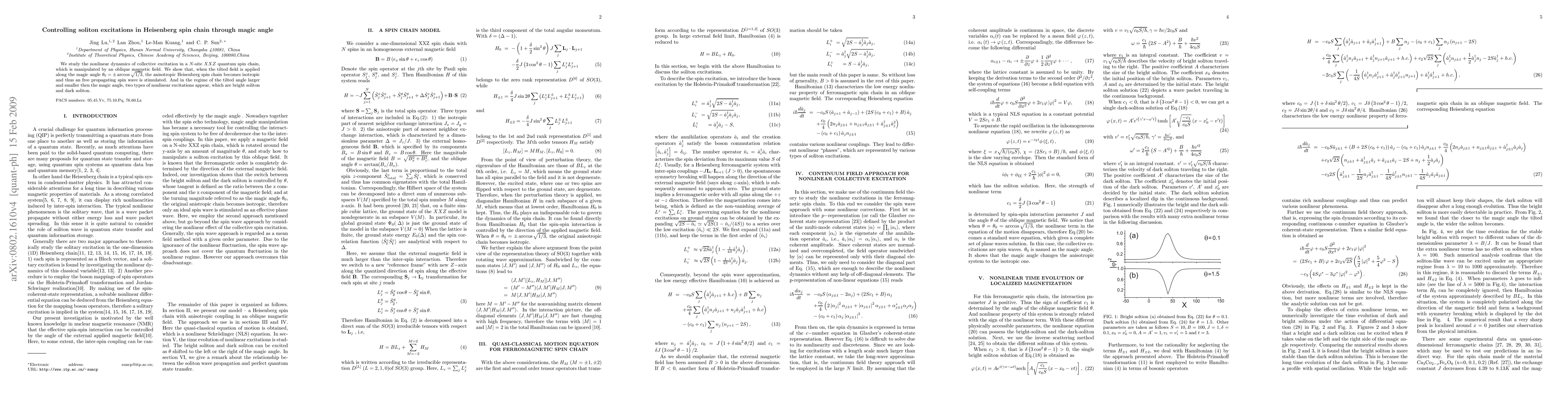 We study the nonlinear dynamics of collective excitation in a $N$-site $XXZ$ quantum spin chain, which is manipulated by an oblique magnetic field. We show that, when the tilted field is applied along the magic angle $\theta_{0} =\pm\arccos \sqrt{1/3}$, the anisotropic Heisenberg spin chain becomes isotropic and thus an free propagating spin wave is stimulated. And in the regime of the tilted angle larger and smaller then the magic angle, two types of nonlinear excitations appear, which are bright soliton and dark soliton.