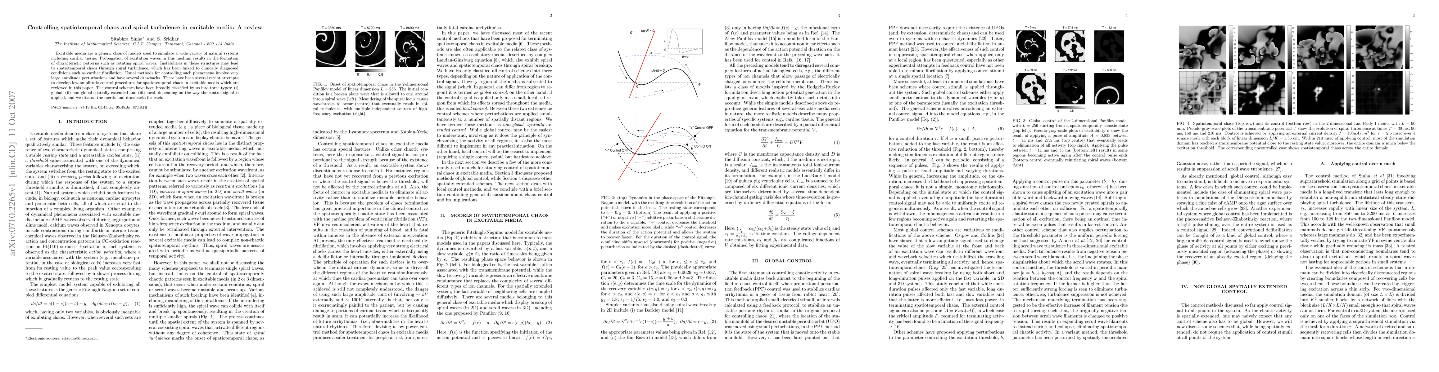 This paper reviews recent advances in controlling spatiotemporal chaos and spiral turbulence in excitable media, focusing on low-amplitude control methods. It categorizes control schemes into global, non-global spatially-extended, and local methods, discussing their respective advantages and limitations.