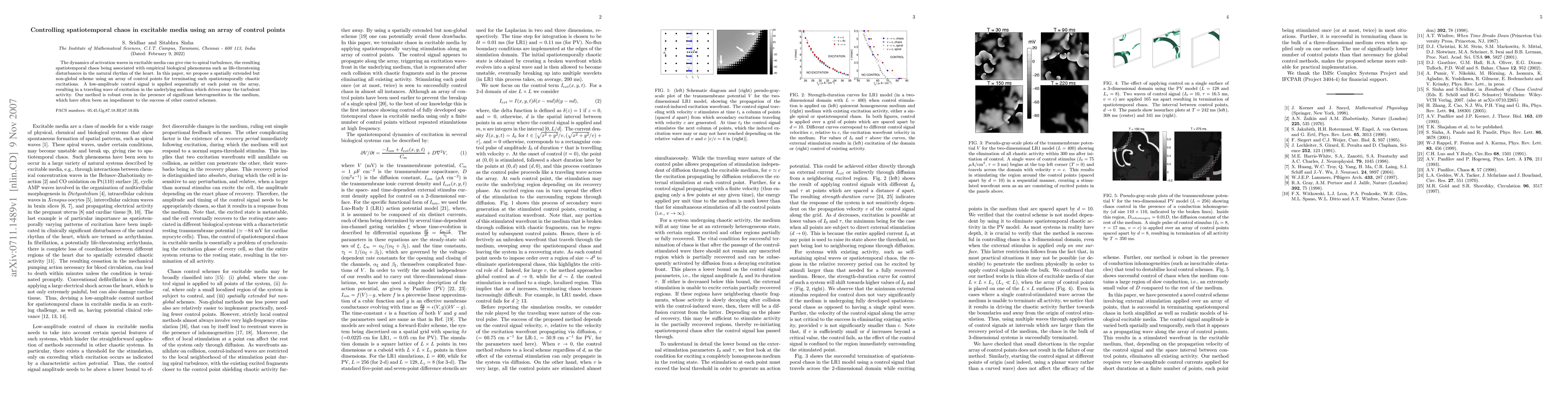 This paper proposes a method to control spatiotemporal chaos in excitable media by using an array of control points to apply low-amplitude signals sequentially, creating a traveling wave that suppresses chaotic excitations. The approach is robust against medium heterogeneities, offering a promising solution for managing chaotic dynamics in biological systems.