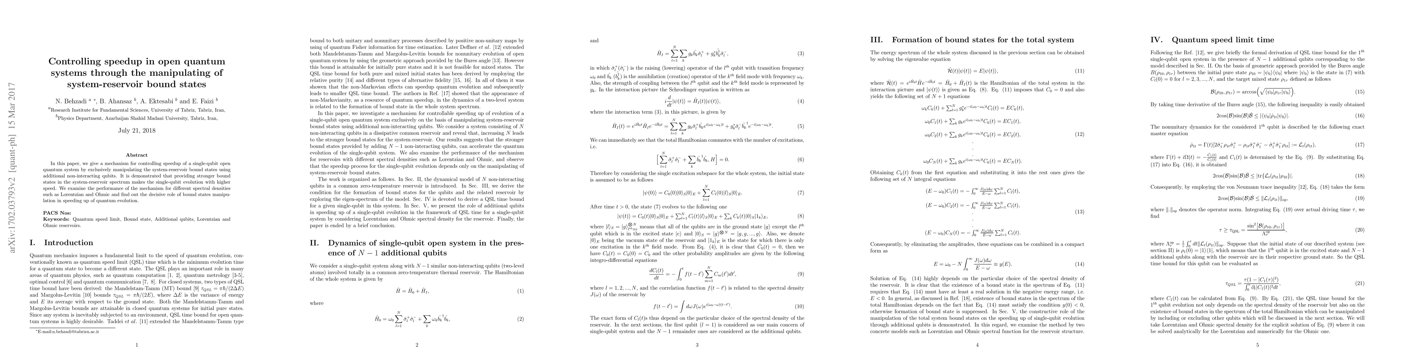 In this paper, we give a mechanism for controlling speedup of a single-qubit open quantum system by exclusively manipulating the system-reservoir bound states using additional non-interacting qubits. It is demonstrated that providing stronger bound states in the system-reservoir spectrum makes the single-qubit evolution with higher speed. We examine the performance of the mechanism for different spectral densities such as Lorentzian and Ohmic and find out the decisive role of bound states manipulation in speeding up of quantum evolution.