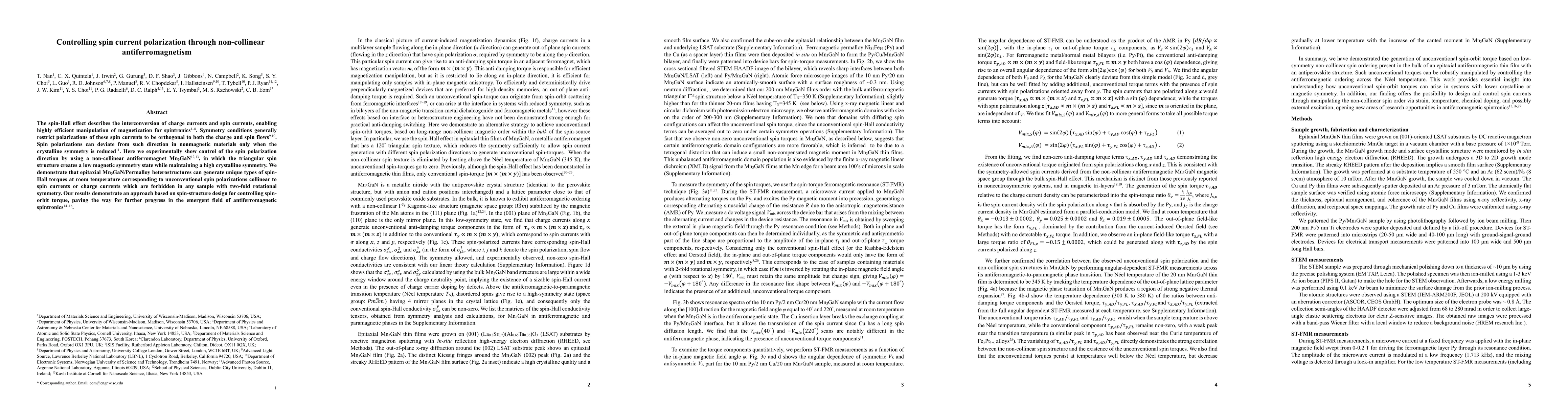 The experimental demonstration and theoretical modeling of controlling spin current polarization through non-collinear antiferromagnetism, specifically using Mn3GaN to generate unique spin-Hall torques with unconventional spin polarizations.