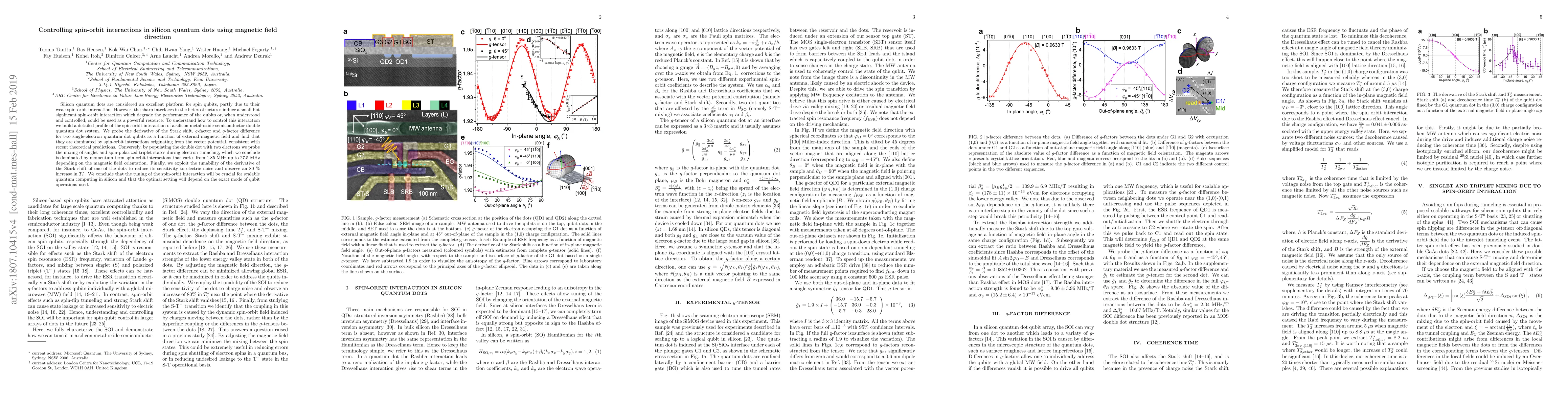 This paper investigates the control of spin-orbit interactions in silicon quantum dots via magnetic field direction, revealing that these interactions significantly affect qubit performance. The study finds that tuning the magnetic field can optimize qubit coherence, achieving an 80% increase in $T_2^*$, highlighting the potential for scalable quantum computing in silicon.