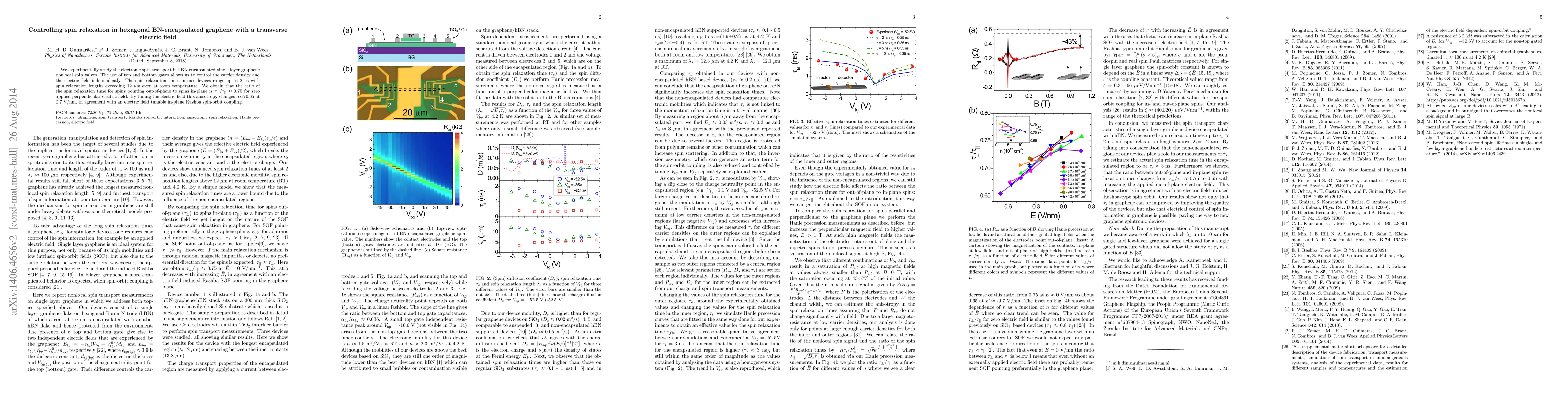 This study investigates spin transport in hexagonal BN-encapsulated graphene using nonlocal spin valves, demonstrating that spin relaxation times can reach up to 2 ns and lengths over 12 µm at room temperature. The electric field can tune the anisotropy of spin relaxation, reducing the ratio of out-of-plane to in-plane spin relaxation from 0.75 to 0.65 at 0.7 V/nm.