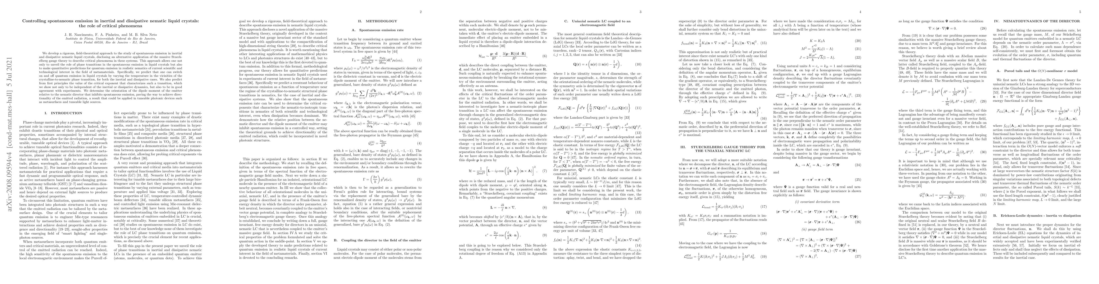 We develop a rigorous, field-theoretical approach to the study of spontaneous emission in inertial and dissipative nematic liquid crystals, disclosing an alternative application of the massive Stueckelberg gauge theory to describe critical phenomena in these systems. This approach allows one not only to unveil the role of phase transitions in the spontaneous emission in liquid crystals but also to make quantitative predictions for quantum emission in realistic nematics of current scientific and technological interest in the field of metamaterials. Specifically, we predict that one can switch on and off quantum emission in liquid crystals by varying the temperature in the vicinities of the crystalline-to-nematic phase transition, for both the inertial and dissipative cases. We also predict from first principles the value of the critical exponent that characterizes such a transition, which we show not only to be independent of the inertial or dissipative dynamics, but also to be in good agreement with experiments. We determine the orientation of the dipole moment of the emitter relative to the nematic director that inhibits spontaneous emission, paving the way to achieve directionality of the emitted radiation, a result that could be applied in tuneable photonic devices such as metasurfaces and tuneable light sources.