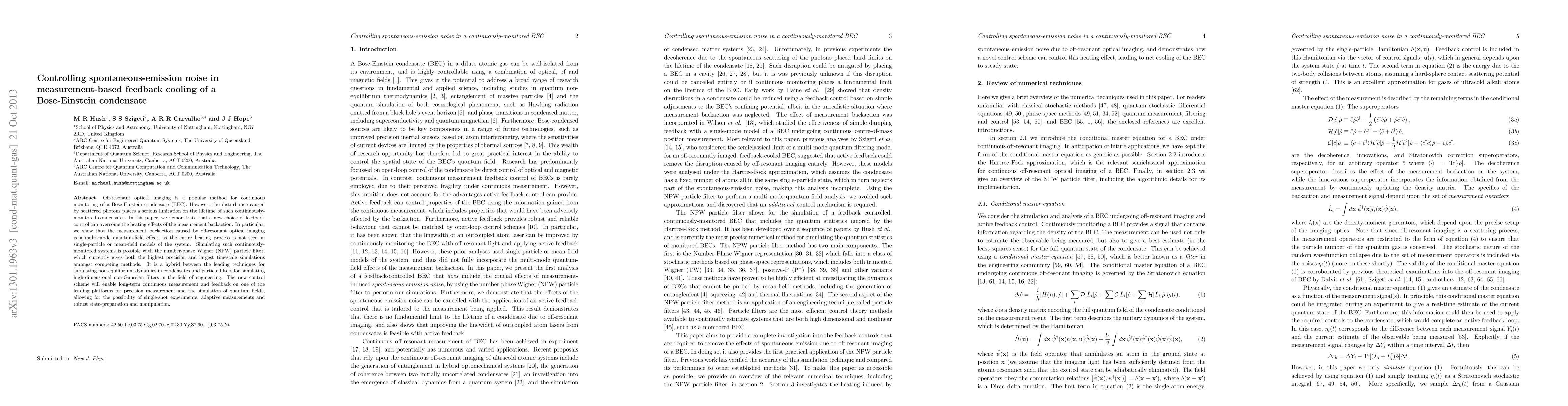 This paper proposes a novel feedback control method to mitigate the spontaneous-emission noise from off-resonant optical imaging in Bose-Einstein condensates, addressing the heating effects caused by scattered photons. The new control scheme, based on the number-phase Wigner particle filter, enables long-term continuous monitoring and enhances precision measurement capabilities.