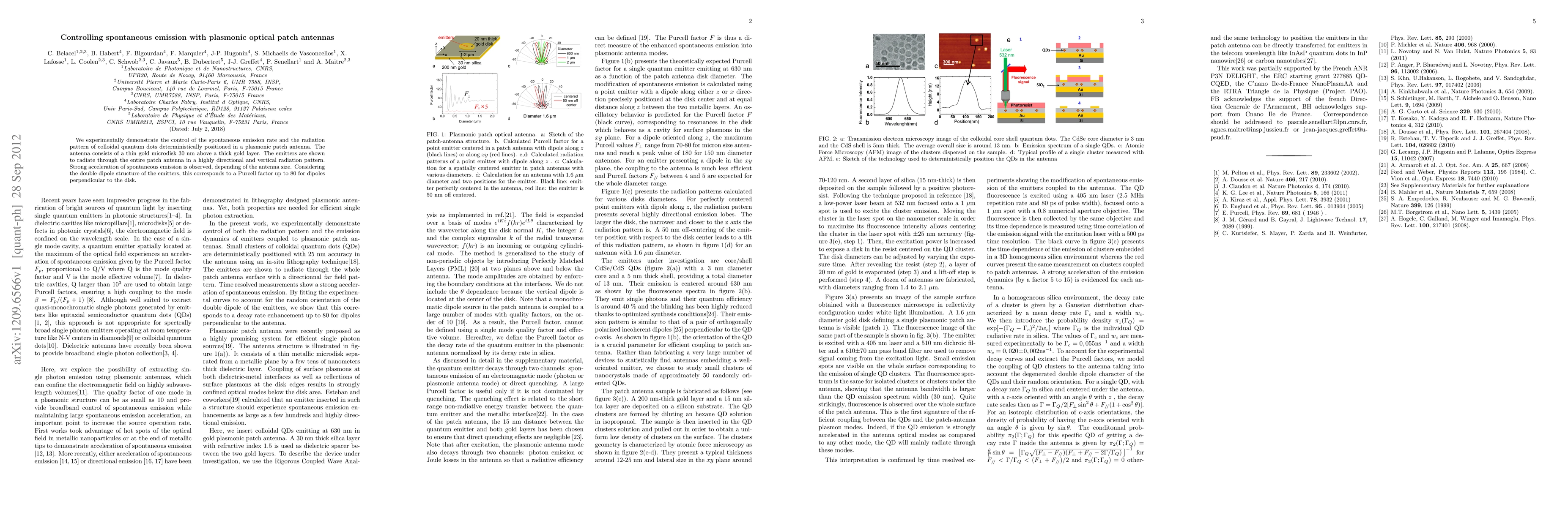 This paper demonstrates the controlled manipulation of colloidal quantum dots' spontaneous emission rate and radiation pattern using a plasmonic patch antenna, achieving highly directional and vertical radiation with a Purcell factor up to 80 for perpendicular dipoles. The antenna's size significantly influences the emission acceleration.