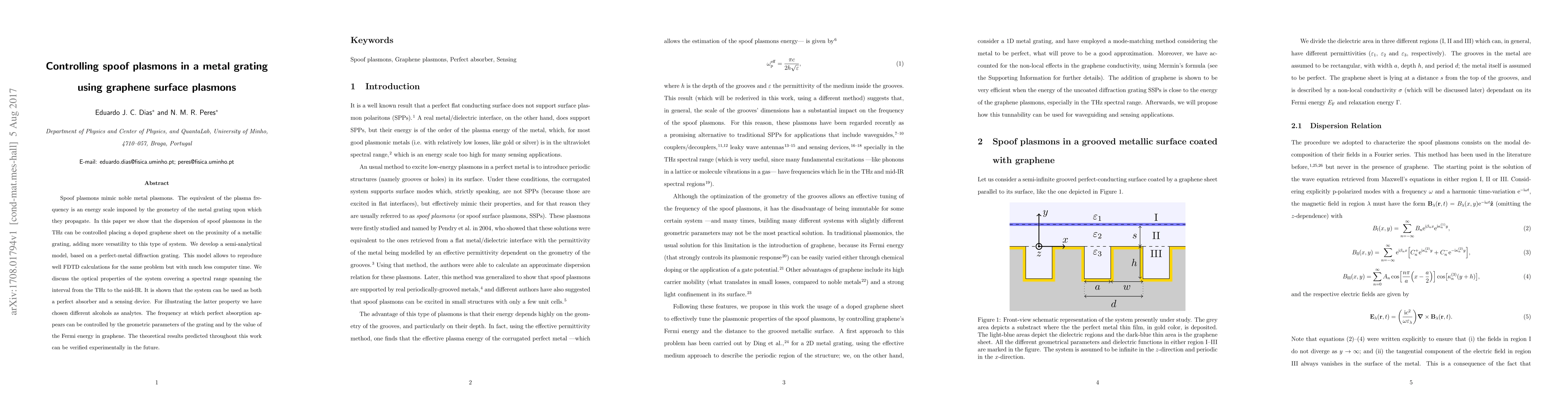 This paper demonstrates how doping graphene can control the dispersion of spoof plasmons in a metal grating, enhancing the system's versatility. A semi-analytical model is developed to efficiently replicate FDTD calculations, showing the system's potential as a perfect absorber and sensor, with absorption frequency tunable by grating geometry and graphene's Fermi energy.