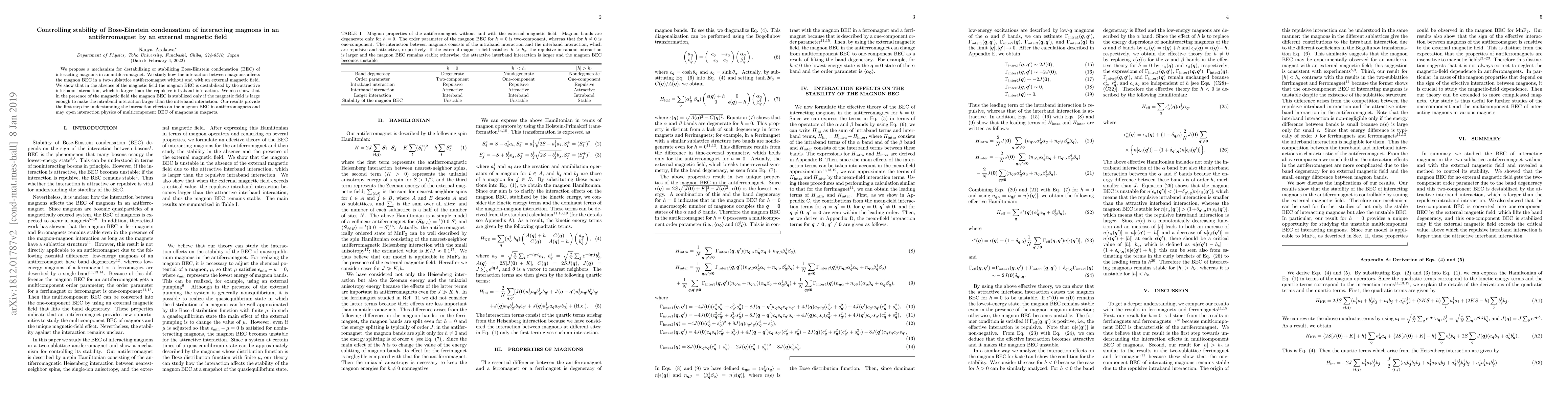 This paper proposes a method to control the stability of Bose-Einstein condensation (BEC) of interacting magnons in antiferromagnets using an external magnetic field. It demonstrates that the magnon BEC is destabilized without a magnetic field due to stronger attractive interband interactions, while a sufficiently strong magnetic field can stabilize it by enhancing intraband interactions.