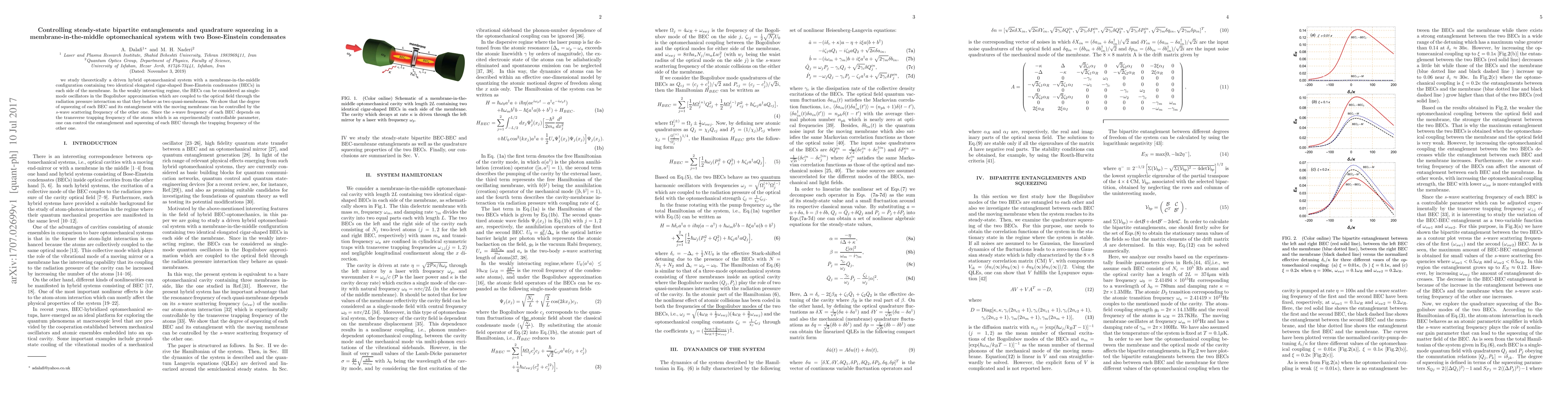 We study theoretically a driven hybrid optomechanical system with a membrane-in-the-middle configuration containing two identical elongated cigar-shaped Bose-Einstein condensates (BECs) in each side of the membrane. In the weakly interacting regime, the BECs can be considered as single-mode oscillators in the Bogoliubov approximation which are coupled to the optical field through the radiation pressure interaction so that they behave as two quasi-membranes. We show that the degree of squeezing of each BEC and its entanglement with the moving membrane can be controlled by the \textit{s}-wave scattering frequency of the other one. Since the \textit{s}-wave frequency of each BEC depends on the transverse trapping frequency of the atoms which is an experimentally controllable parameter, one can control the entanglement and squeezing of each BEC through the trapping frequency of the other one.
