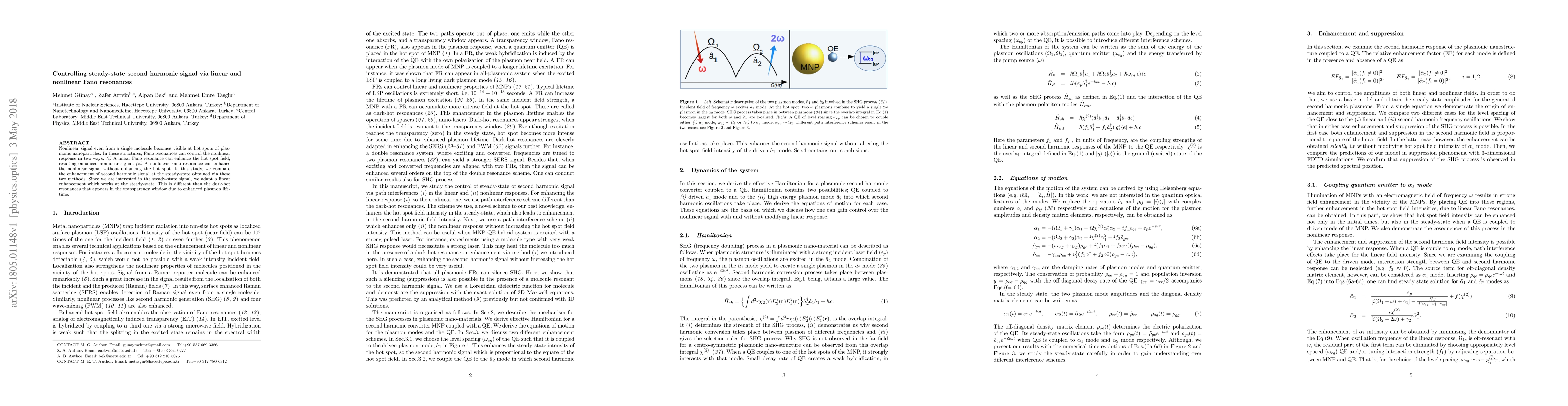Nonlinear signal even from a single molecule becomes visible at hot spots of plasmonic nanoparticles. In these structures, Fano resonances can control the nonlinear response in two ways. \textit{(i)} A linear Fano resonance can enhance the hot spot field, resulting enhanced nonlinear signal. \textit{(ii)} A nonlinear Fano resonance can enhance the nonlinear signal without enhancing the hot spot. In this study, we compare the enhancement of second harmonic signal at the steady-state obtained via these two methods. Since we are interested in the steady-state signal, we adapt a linear enhancement which works at the steady-state. This is different than the dark-hot resonances that appears in the transparency window due to enhanced plasmon lifetime.