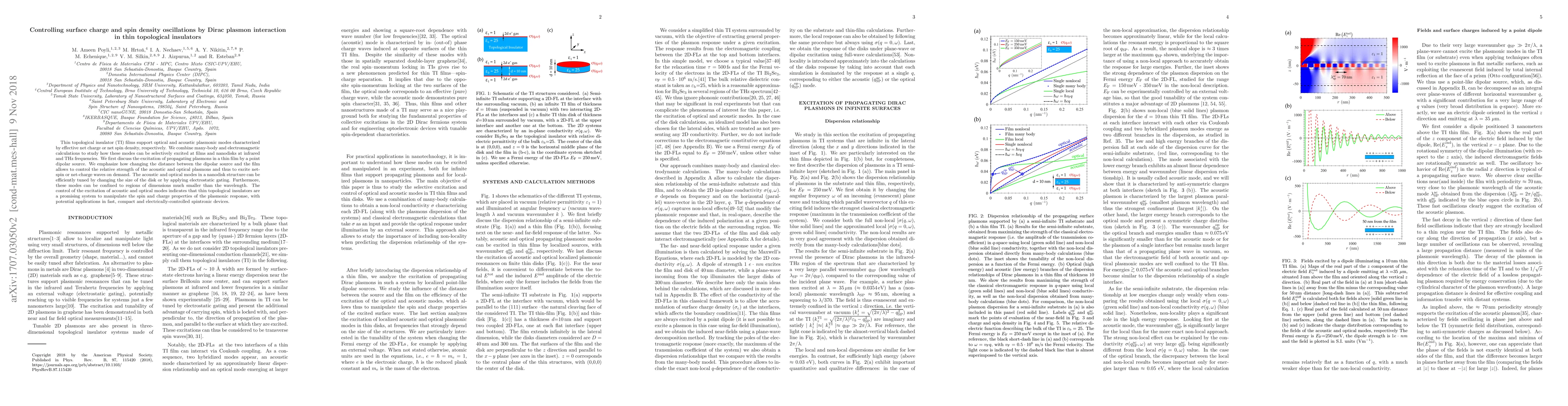 We study the selective excitation at infrared and THz frequencies of optical and acoustic plasmonic modes supported by thin topological insulators. These modes are characterized by effective net charge or net spin density, respectively, and we study their excitation by combining many-body and electromagnetic calculations. We first show that non-locality can significantly modify the plasmonic response: it changes the energy of propagating plasmons up to tens of percent. We then discuss how, by changing the distance between a dipolar source and a semi-infinite 10 nm thin film, it is possible to control the excitation of acoustic and optical propagating plasmons, which can propagate over a distance of several plasmonic wavelengths. Furthermore, we consider 10 nm thin TI nanodisks and study the excitation of acoustic and optical localized plasmon modes by a point dipole source and plane wave illumination, respectively. The resonant plasmonic modes appear at frequencies that strongly depends on the size of the disk, and that can be potentially tuned by applying electrostatic gating to modify the Fermi Energy of the conductive 2-dimensional layer that forms at the interfaces of the TI. We observe a spectral shift from ~29 $\mu$m to ~34 $\mu$m by changing the Fermi Energy from 250meV to 350meV. Last, the electromagnetic energy of these plasmonics modes can be confined to very small regions, of effective volume ~(120 nm)^3 for the smaller disk considered, much less than the free-space wavelength cubed $\lambda$^3 ~(35000 nm)^3. The strong confinement is desirable for achieving very efficient coupling with nearby systems. Our detailed study thus shows that thin topological insulators are a promising system to control both the spin and charge oscillations associated with the plasmonic resonances, with possible applications to fast, compact and electrically-controlled spintronics devices.