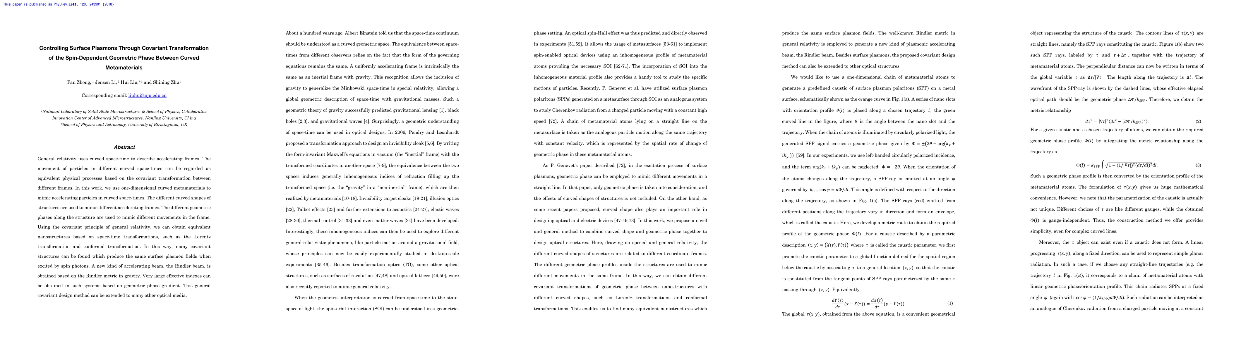 General relativity uses curved space-time to describe accelerating frames. The movement of particles in different curved space-times can be regarded as equivalent physical processes based on the covariant transformation between different frames. In this work, we use one-dimensional curved metamaterials to mimic accelerating particles in curved space-times. The different curved shapes of structures are used to mimic different accelerating frames. The different geometric phases along the structure are used to mimic different movements in the frame. Using the covariant principle of general relativity, we can obtain equivalent nanostructures based on space-time transformations, such as the Lorentz transformation and conformal transformation. In this way, many covariant structures can be found which produce the same surface plasmon fields when excited by spin photons. A new kind of accelerating beam, the Rindler beam, is obtained based on the Rindler metric in gravity. Very large effective indexes can be obtained in such systems based on geometric phase gradient. This general covariant design method can be extended to many other optical media.
