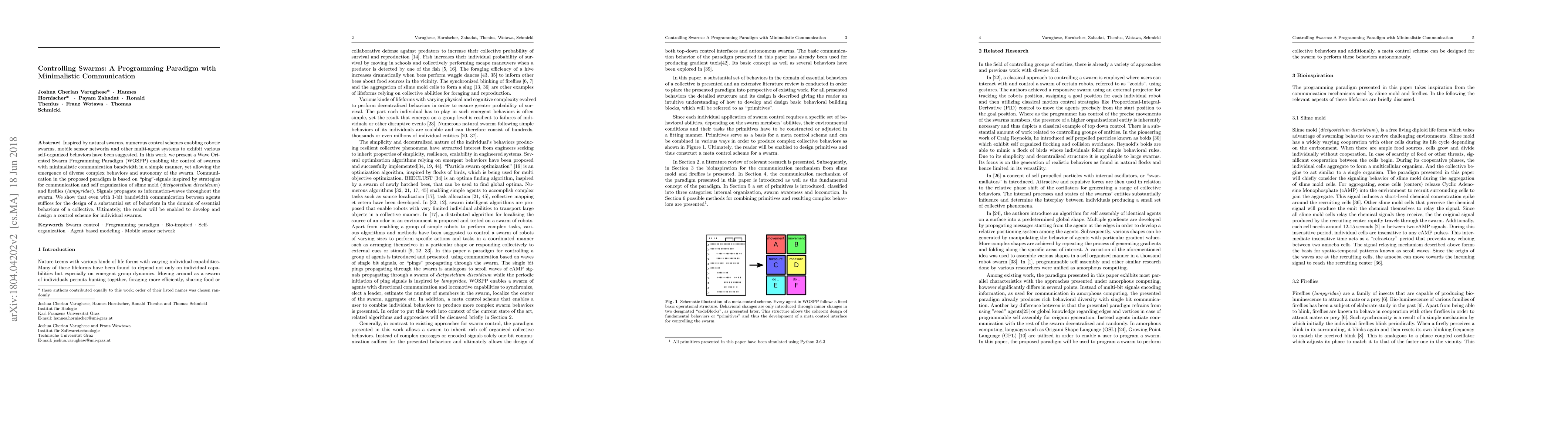 This paper introduces the Wave Oriented Swarm Programming Paradigm (WOSPP) to control robotic swarms with minimal communication, inspired by slime mold and fireflies. It demonstrates that 1-bit bandwidth can enable diverse complex behaviors and autonomy in swarms.