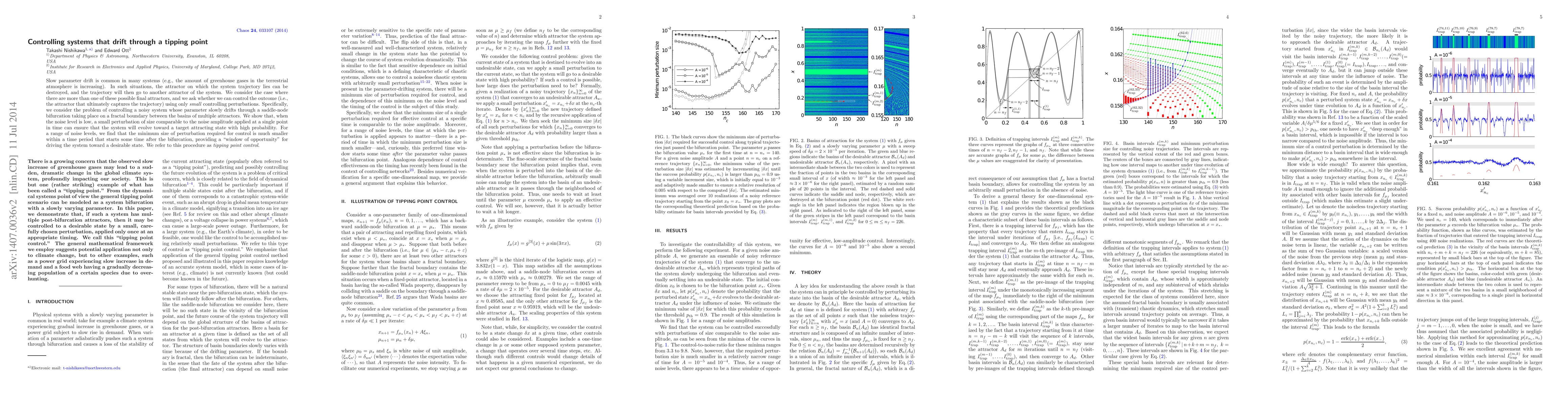 Slow parameter drift is common in many systems (e.g., the amount of greenhouse gases in the terrestrial atmosphere is increasing). In such situations, the attractor on which the system trajectory lies can be destroyed, and the trajectory will then go to another attractor of the system. We consider the case where there are more than one of these possible final attractors, and we ask whether we can control the outcome (i.e., the attractor that ultimately captures the trajectory) using only small controlling perturbations. Specifically, we consider the problem of controlling a noisy system whose parameter slowly drifts through a saddle-node bifurcation taking place on a fractal boundary between the basins of multiple attractors. We show that, when the noise level is low, a small perturbation of size comparable to the noise amplitude applied at a single point in time can ensure that the system will evolve toward a target attracting state with high probability. For a range of noise levels, we find that the minimum size of perturbation required for control is much smaller within a time period that starts some time after the bifurcation, providing a "window of opportunity" for driving the system toward a desirable state. We refer to this procedure as tipping point control.