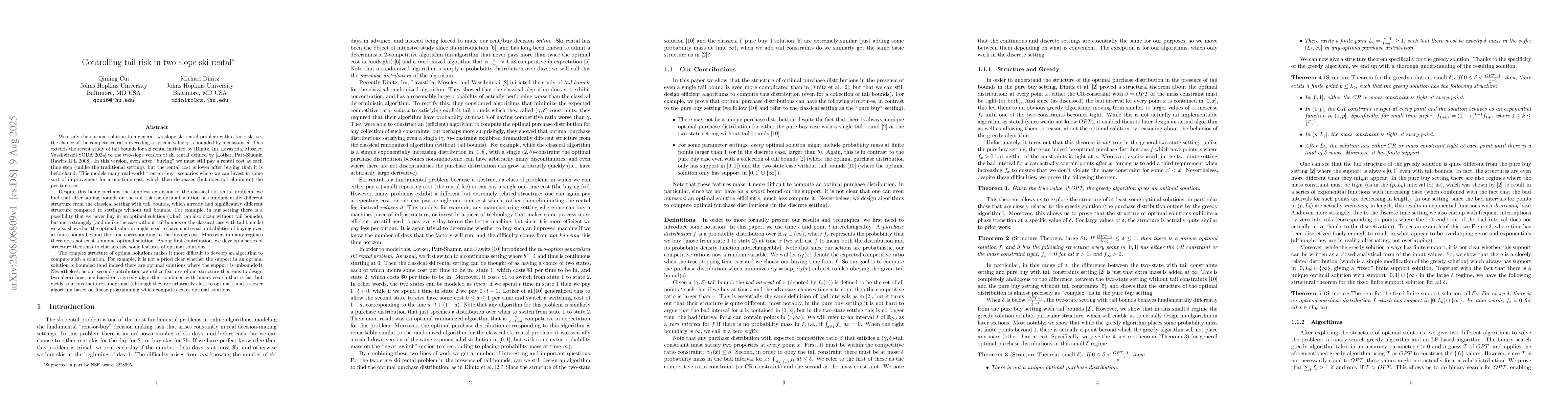 The paper extends the study of two-slope ski rental problems with tail risk bounds, building upon previous work by Dinitz et al. (SODA 2024) and Lotker et al. (IPL 2008). It characterizes optimal solutions through structure theorems and proposes algorithms for computing them.