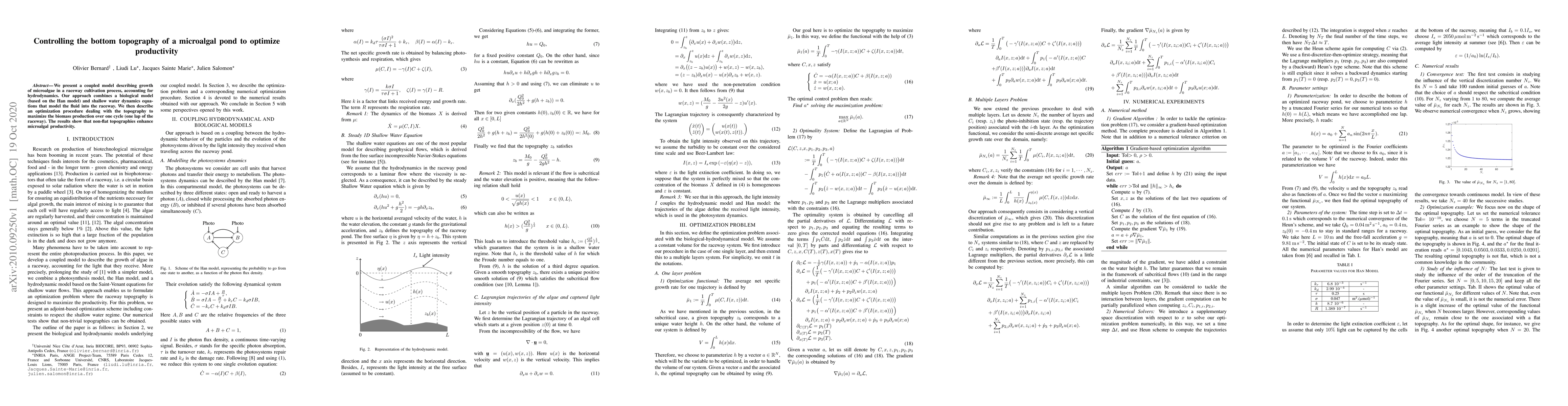This study combines biological and hydrodynamic models to optimize microalgal productivity in raceway ponds, demonstrating that non-flat bottom topographies significantly enhance biomass production. The optimization procedure reveals the potential benefits of tailored pond designs for improved microalgal growth.