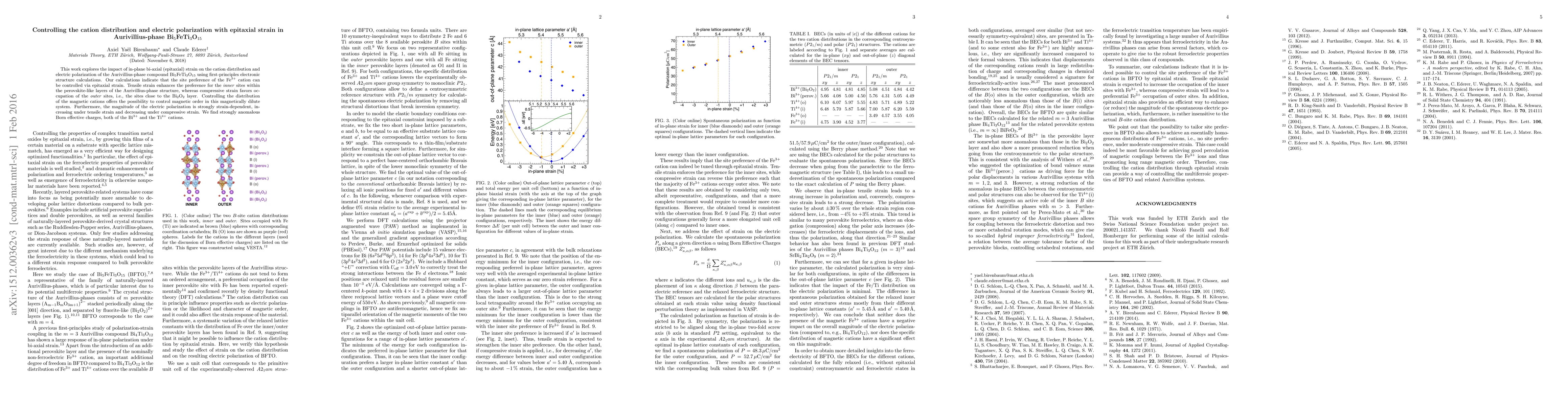 This work explores the impact of in-plane bi-axial (epitaxial) strain on the cation distribution and electric polarization of the Aurivillius-phase compound Bi$_5$FeTi$_3$O$_{15}$ using first-principles electronic structure calculations. Our calculations indicate that the site preference of the Fe$^{3+}$ cation can be controlled via epitaxial strain. Tensile strain enhances the preference for the inner sites within the perovskite-like layers of the Aurivillius-phase structure, whereas compressive strain favors occupation of the outer sites within the perovskite-layers, i.e., the sites close to the Bi$_2$O$_2$ layer. Controlling the distribution of the magnetic cations offers the possibility to control magnetic order in this magnetically dilute system. Furthermore, the magnitude of the electric polarization is strongly strain-dependent, increasing under tensile strain and decreasing under compressive strain. Analysis of the Born effective charges reveals strongly anomalous charges, both of the Bi$^{3+}$ cations and the Ti$^{4+}$ cations.