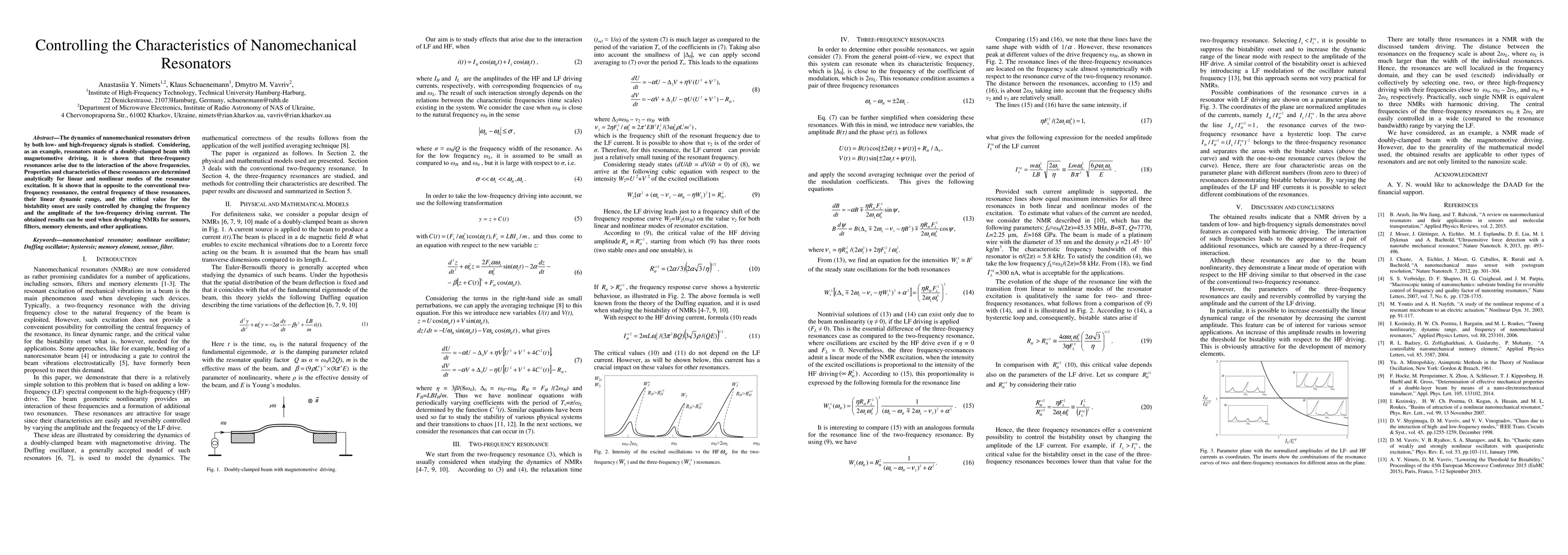 The dynamics of nanomechanical resonators driven by both low- and high-frequency signals is studied. Considering, as an example, resonators made of a doubly-clamped beam with magnetomotive driving, it is shown that three-frequency resonances arise due to the interaction of the above frequencies. Properties and characteristics of these resonances are determined analytically for linear and nonlinear modes of the resonator excitation. It is shown that in opposite to the conventional two-frequency resonance, the central frequency of these resonances, their linear dynamic range, and the critical value for the bistability onset are easily controlled by changing the frequency and the amplitude of the low-frequency driving current. The obtained results can be used when developing NMRs for sensors, filters, memory elements, and other applications.