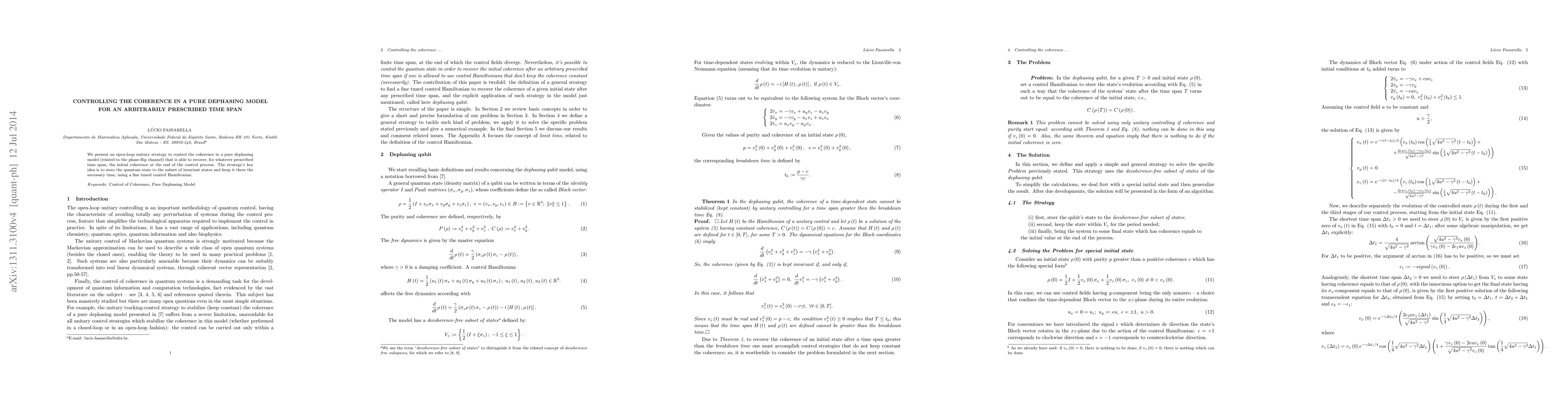 This paper proposes an open-loop unitary control strategy to manage coherence in a pure dephasing model, ensuring the initial coherence is fully restored after a specified duration by steering the quantum state to invariant states using a precisely tuned control Hamiltonian.