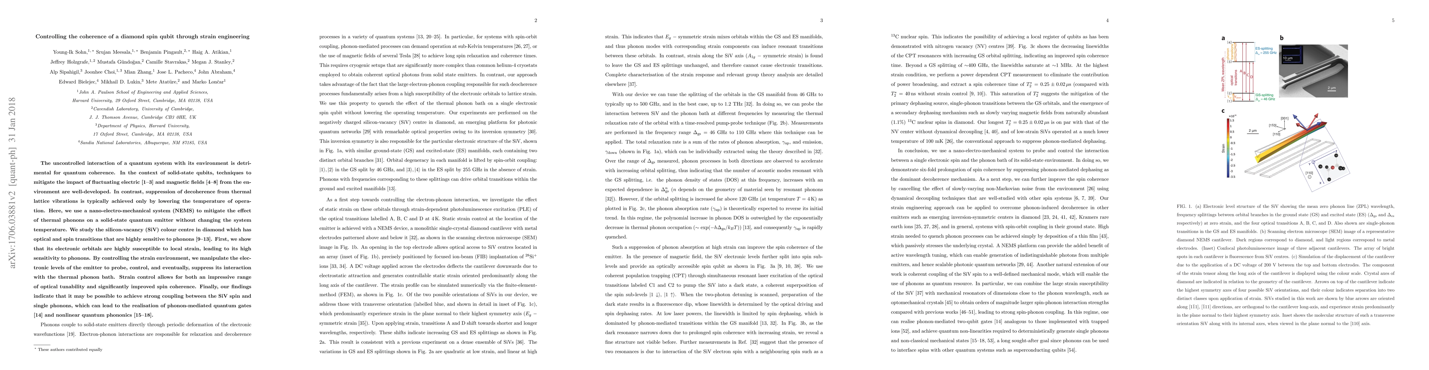 The uncontrolled interaction of a quantum system with its environment is detrimental for quantum coherence. In the context of solid-state qubits, techniques to mitigate the impact of fluctuating electric and magnetic fields from the environment are well-developed. In contrast, suppression of decoherence from thermal lattice vibrations is typically achieved only by lowering the temperature of operation. Here, we use a nano-electro-mechanical system (NEMS) to mitigate the effect of thermal phonons on a solid-state quantum emitter without changing the system temperature. We study the silicon-vacancy (SiV) colour centre in diamond which has optical and spin transitions that are highly sensitive to phonons. First, we show that its electronic orbitals are highly susceptible to local strain, leading to its high sensitivity to phonons. By controlling the strain environment, we manipulate the electronic levels of the emitter to probe, control, and eventually, suppress its interaction with the thermal phonon bath. Strain control allows for both an impressive range of optical tunability and significantly improved spin coherence. Finally, our findings indicate that it may be possible to achieve strong coupling between the SiV spin and single phonons, which can lead to the realisation of phonon-mediated quantum gates and nonlinear quantum phononics.