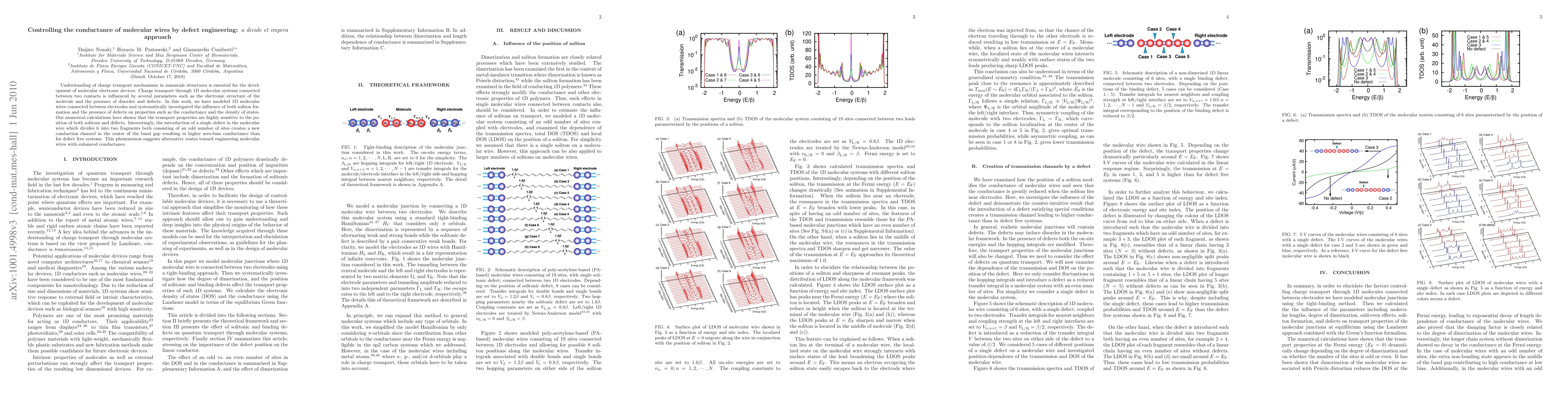 Understanding of charge transport mechanisms in nanoscale structures is essential for the development of molecular electronic devices. Charge transport through 1D molecular systems connected between two contacts is influenced by several parameters such as the electronic structure of the molecule and the presence of disorder and defects. In this work, we have modeled 1D molecular wires connected between electrodes and systematically investigated the influence of both soliton formation and the presence of defects on properties such as the conductance and the density of states. Our numerical calculations have shown that the transport properties are highly sensitive to the position of both solitons and defects. Interestingly, the introduction of a single defect in the molecular wire which divides it into two fragments both consisting of an odd number of sites creates a new conduction channel in the center of the band gap resulting in higher zero-bias conductance than for defect free systems. This phenomenon suggests alternative routes toward engineering molecular wires with enhanced conductance.
