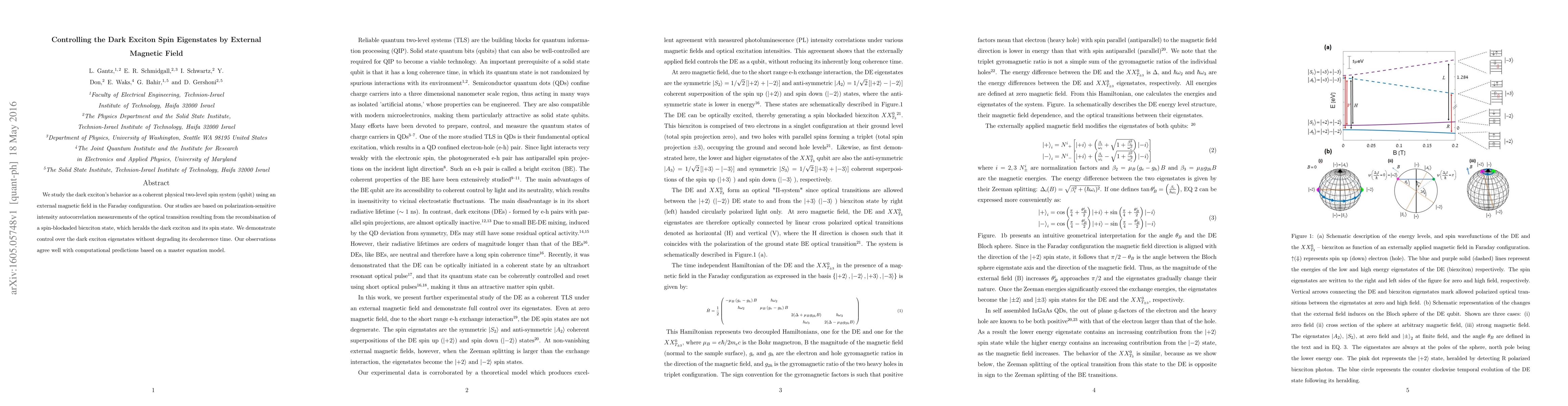 This paper investigates the manipulation of dark exciton spin eigenstates using an external magnetic field, demonstrating control without affecting decoherence time, and aligns with theoretical predictions from a master equation model.