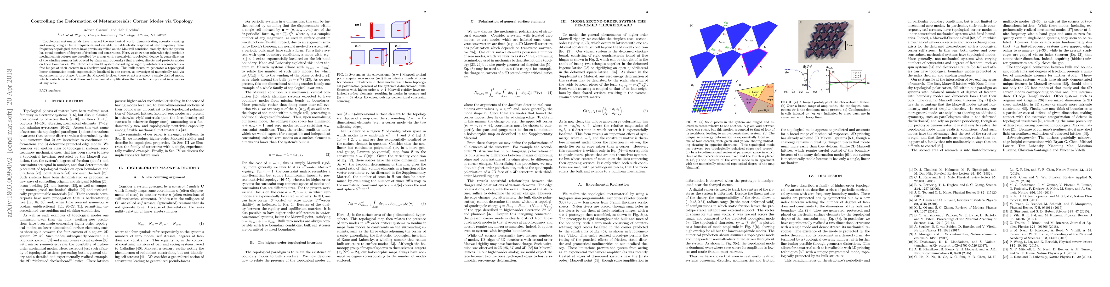This paper explores how topological metamaterials can control deformation through corner modes, demonstrating a new model of rigid quadrilaterals connected by hinges. This structure generates a topological deformation mode localized at a single corner, enabling tunable elastic response and mechanical amplification, unlike traditional Maxwell lattices.