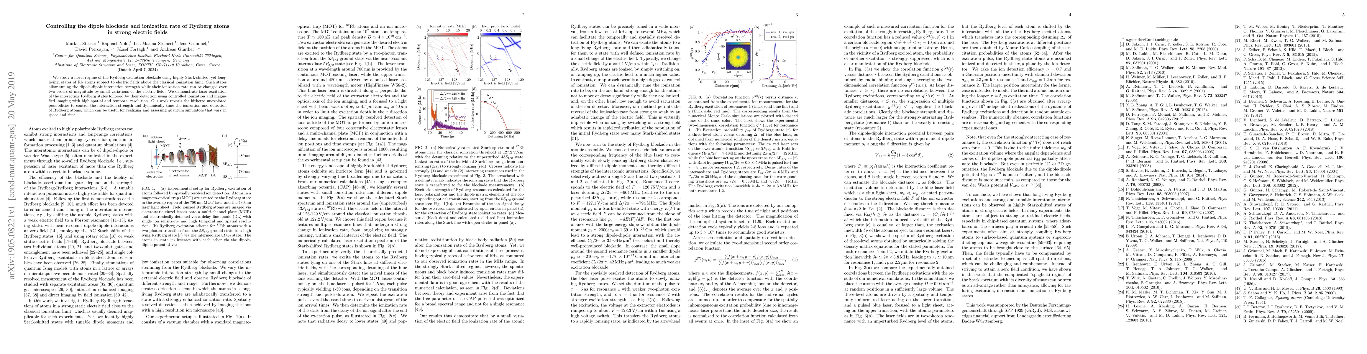 This paper explores the control of Rydberg atoms' dipole blockade and ionization rate in strong electric fields, demonstrating the ability to tune interaction strength and ionization rate by adjusting the electric field. The study employs Stark-shifted Rydberg states of Rb atoms, showing high-resolution detection via controlled ionization and imaging, with implications for dynamic quantum simulators.