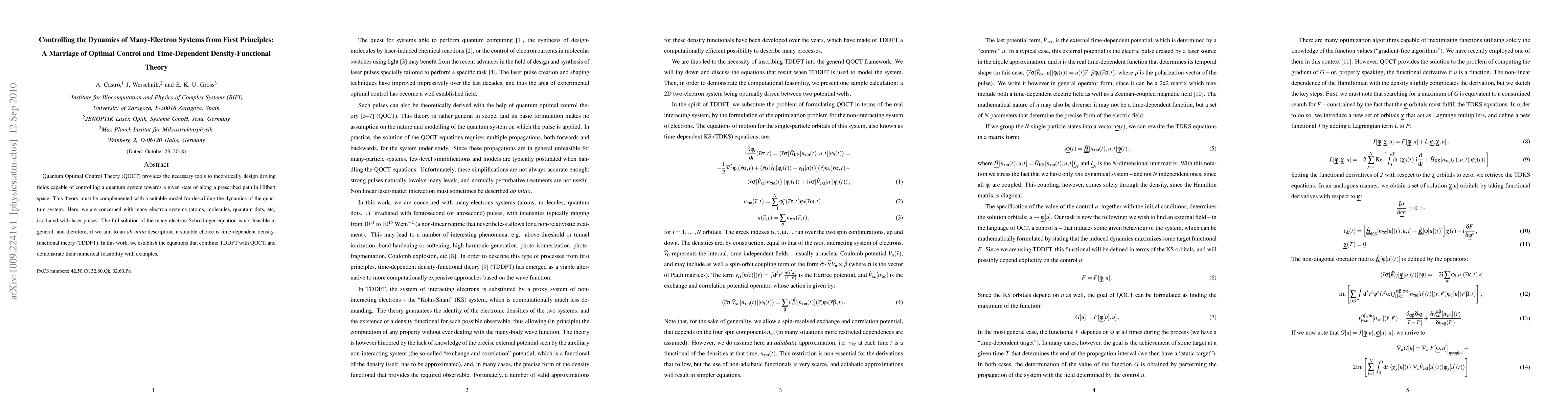 Quantum Optimal Control Theory (QOCT) provides the necessary tools to theoretically design driving fields capable of controlling a quantum system towards a given state or along a prescribed path in Hilbert space. This theory must be complemented with a suitable model for describing the dynamics of the quantum system. Here, we are concerned with many electron systems (atoms, molecules, quantum dots, etc) irradiated with laser pulses. The full solution of the many electron Schr{\"{o}}dinger equation is not feasible in general, and therefore, if we aim to an ab initio description, a suitable choice is time-dependent density-functional theory (TDDFT). In this work, we establish the equations that combine TDDFT with QOCT, and demonstrate their numerical feasibility with examples.