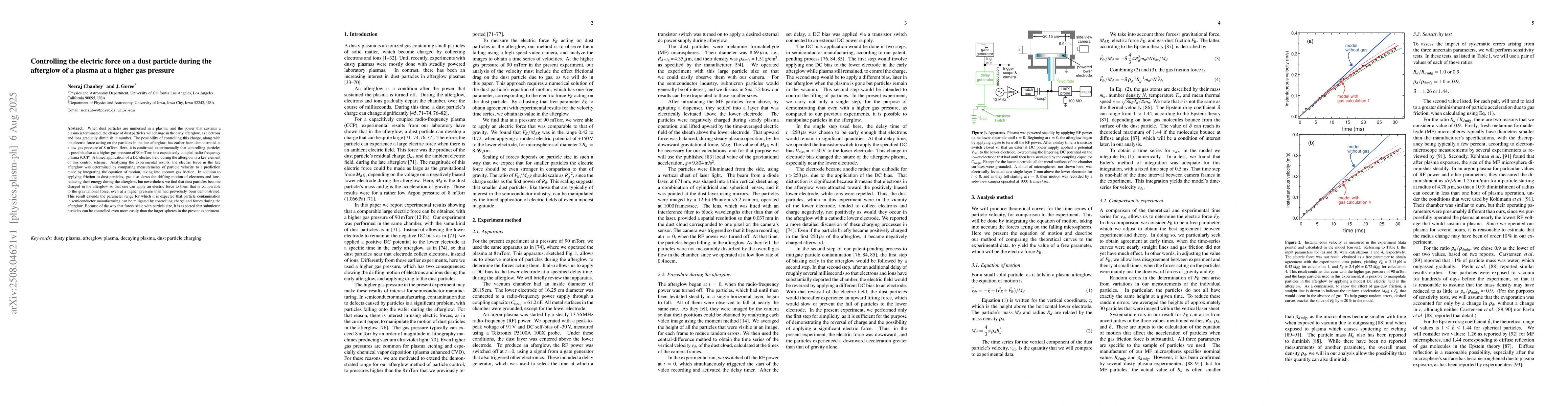 When dust particles are immersed in a plasma, and the power that sustains a plasma is terminated, the charge of dust particles will change in the early afterglow, as electrons and ions gradually diminish in number. The possibility of controlling this charge, along with the electric force acting on the particles in the late afterglow, has earlier been demonstrated at a low gas pressure of 8 mTorr. Here, it is confirmed experimentally that controlling particles is possible also at a higher gas pressure of 90 mTorr, in a capacitively coupled radio-frequency plasma (CCP). A timed application of a DC electric field during the afterglow is a key element of this control scheme. Analyzing the experimental results, the electric force in the late afterglow was determined by comparing measurements of particle velocity to a prediction made by integrating the equation of motion, taking into account gas friction. In addition to applying friction to dust particles, gas also slows the drifting motion of electrons and ions, reducing their energy during the afterglow, but nevertheless we find that dust particles become charged in the afterglow so that one can apply an electric force to them that is comparable to the gravitational force, even at a higher pressure than had previously been demonstrated. This result extends the parameter range for which it is expected that particle contamination in semiconductor manufacturing can be mitigated by controlling charge and forces during the afterglow. Because of the way that forces scale with particle size, it is expected that submicron particles can be controlled even more easily than the larger spheres in the present experiment.