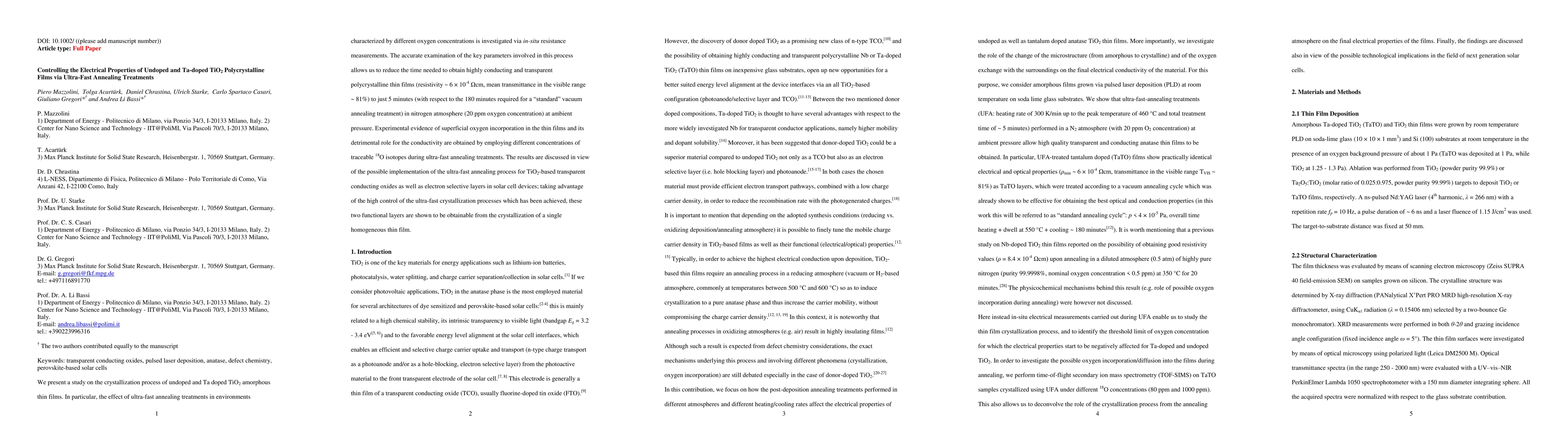 We present a study on the crystallization process of undoped and Ta doped TiO2 amorphous thin films. In particular, the effect of ultra-fast annealing treatments in environments characterized by different oxygen concentrations is investigated via in-situ resistance measurements. The accurate examination of the key parameters involved in this process allows us to reduce the time needed to obtain highly conducting and transparent polycrystalline thin films (resistivity about $6 \times 10^{-4}$ {\Omega}cm, mean transmittance in the visible range about $81\%$) to just 5 minutes (with respect to the 180 minutes required for a standard vacuum annealing treatment) in nitrogen atmosphere (20 ppm oxygen concentration) at ambient pressure. Experimental evidence of superficial oxygen incorporation in the thin films and its detrimental role for the conductivity are obtained by employing different concentrations of traceable 18O isotopes during ultra-fast annealing treatments. The results are discussed in view of the possible implementation of the ultra-fast annealing process for TiO2-based transparent conducting oxides as well as electron selective layers in solar cell devices; taking advantage of the high control of the ultra-fast crystallization processes which has been achieved, these two functional layers are shown to be obtainable from the crystallization of a single homogeneous thin film.
