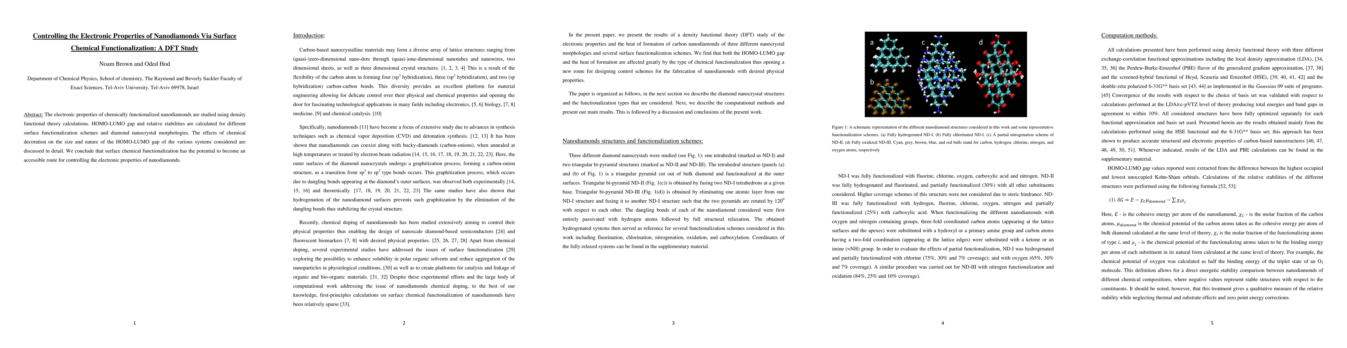 This paper uses density functional theory to investigate how surface chemical functionalization alters the electronic properties of nanodiamonds, focusing on HOMO-LUMO gaps and relative stability. The study concludes that functionalization can effectively control nanodiamonds' electronic characteristics.