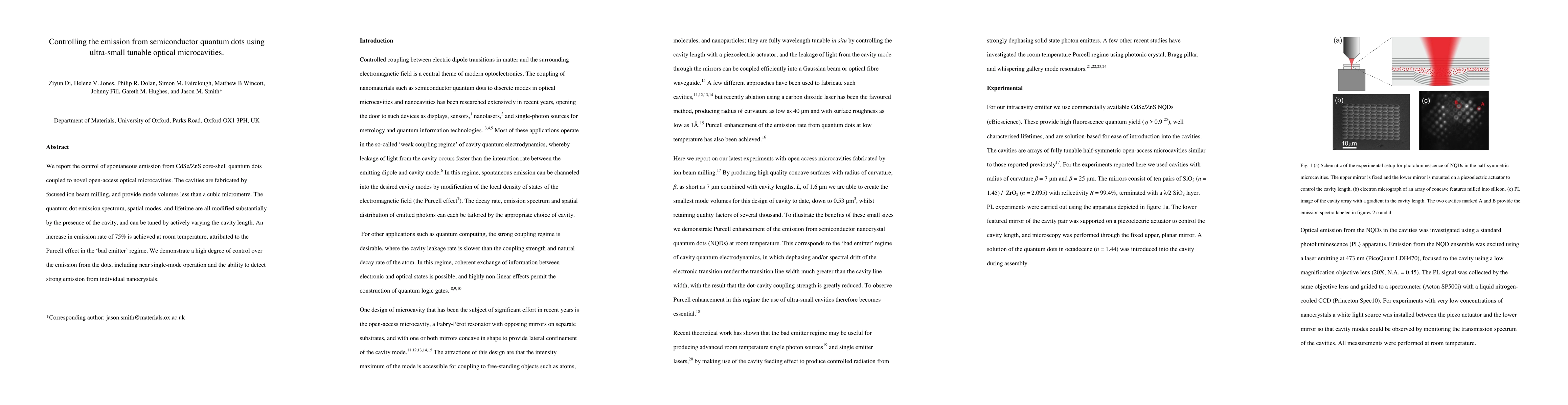 This paper details the control of spontaneous emission from CdSe/ZnS quantum dots using ultra-small tunable optical microcavities, showing a 75% increase in emission rate due to the Purcell effect. The cavities enable tuning of quantum dot emission spectrum, spatial modes, and lifetime by varying the cavity length.