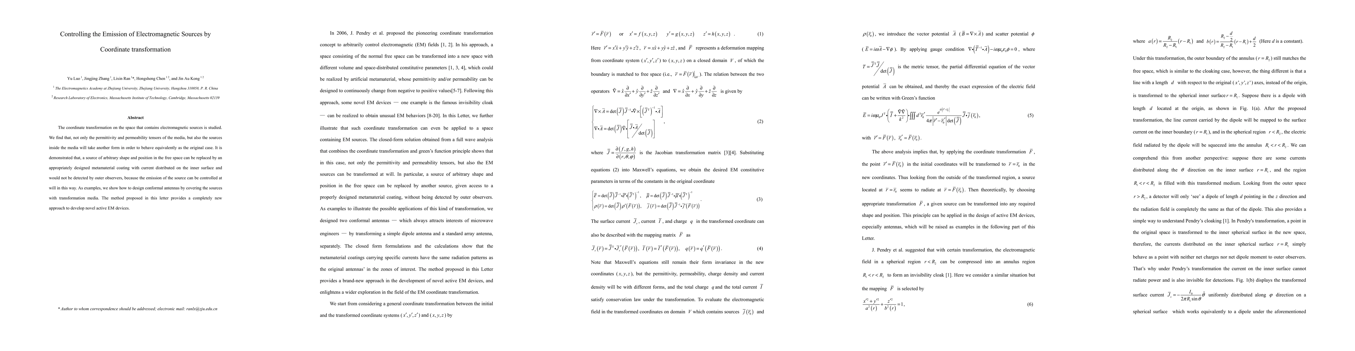 This paper explores how coordinate transformation can control electromagnetic source emissions by altering the permittivity and permeability tensors, effectively replacing arbitrary sources with metamaterial coatings that render them undetectable. The method also demonstrates the design of conformal antennas using transformation media, offering a novel approach to active electromagnetic devices.