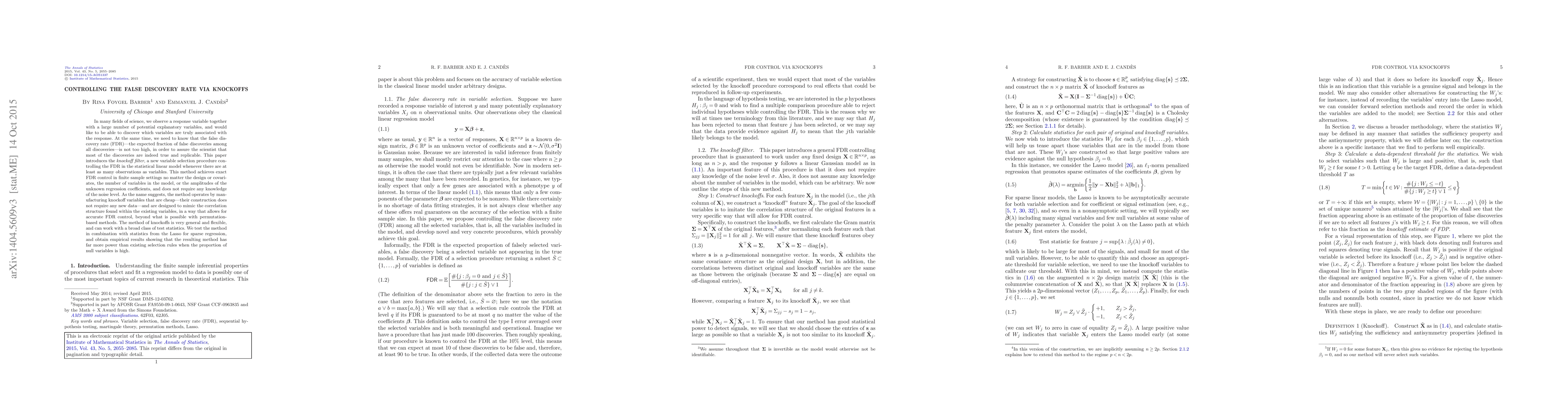 This paper introduces the knockoff filter, a new method for variable selection that controls the false discovery rate (FDR) in linear models, achieving exact FDR control without requiring knowledge of the noise level. The method uses knockoff variables to mimic existing variables' correlation structure, offering more power than existing methods when many variables are irrelevant.