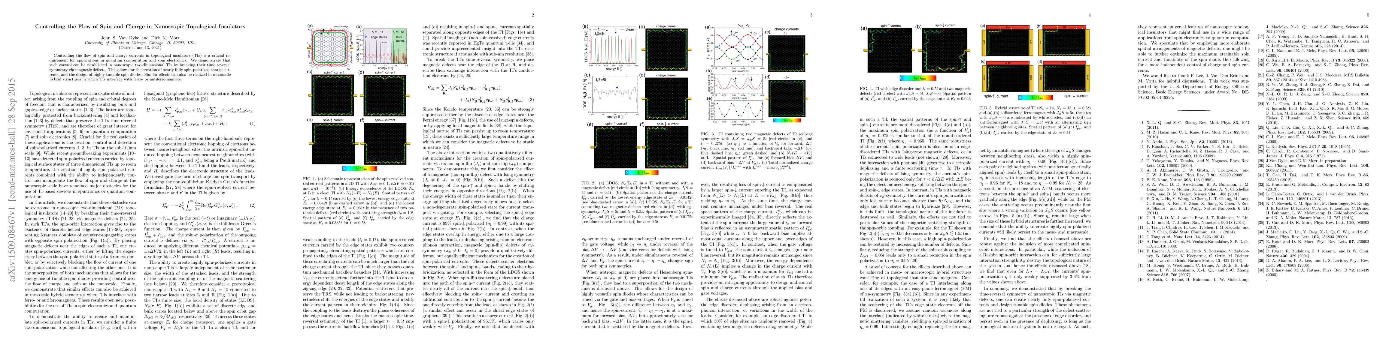 This paper demonstrates control over spin and charge currents in nanoscopic topological insulators by introducing magnetic defects to break time reversal symmetry, enabling nearly fully spin-polarized currents and the design of tunable spin diodes. These effects are also applicable in mesoscale hybrid structures combining TIs with ferro- or antiferromagnets.