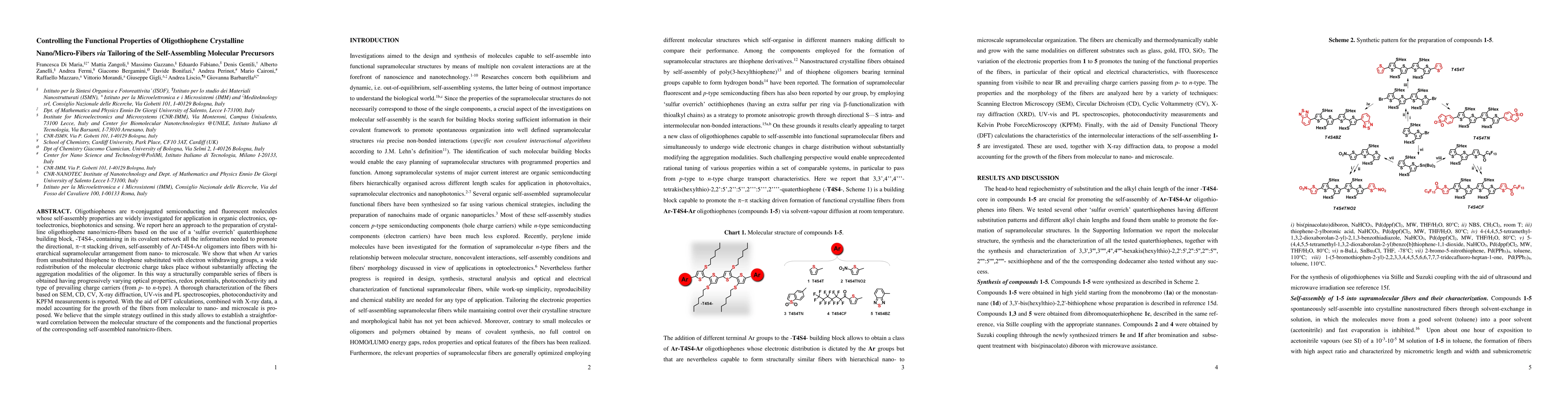 This paper presents a method to control the functional properties of oligothiophene crystalline nano/micro-fibers by tailoring self-assembling molecular precursors. By varying the substituents on a sulfur overrich quaterthiophene building block, the authors achieve a range of optical properties, redox potentials, and charge carrier types in the fibers, demonstrating a direct correlation between molecular structure and fiber functionality.
