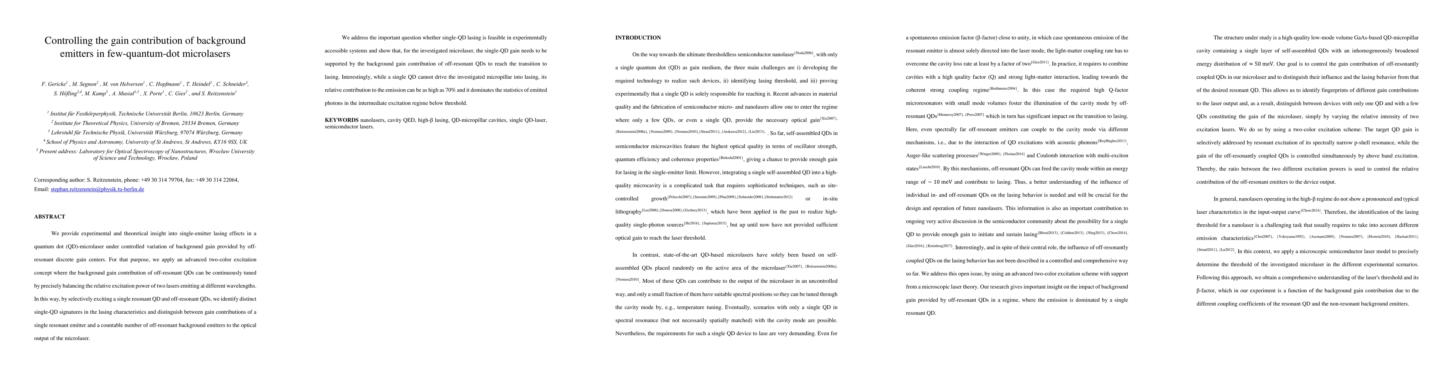 We provide experimental and theoretical insight into single-emitter lasing effects in a quantum dot (QD)-microlaser under controlled variation of background gain provided by off-resonant discrete gain centers. For that purpose, we apply an advanced two-color excitation concept where the background gain contribution of off-resonant QDs can be continuously tuned by precisely balancing the relative excitation power of two lasers emitting at different wavelengths. In this way, by selectively exciting a single resonant QD and off-resonant QDs, we identify distinct single-QD signatures in the lasing characteristics and distinguish between gain contributions of a single resonant emitter and a countable number of off-resonant background emitters to the optical output of the microlaser. We address the important question whether single-QD lasing is feasible in experimentally accessible systems and show that, for the investigated microlaser, the single-QD gain needs to be supported by the background gain contribution of off-resonant QDs to reach the transition to lasing. Interestingly, while a single QD cannot drive the investigated micropillar into lasing, its relative contribution to the emission can be as high as 70% and it dominates the statistics of emitted photons in the intermediate excitation regime below threshold.